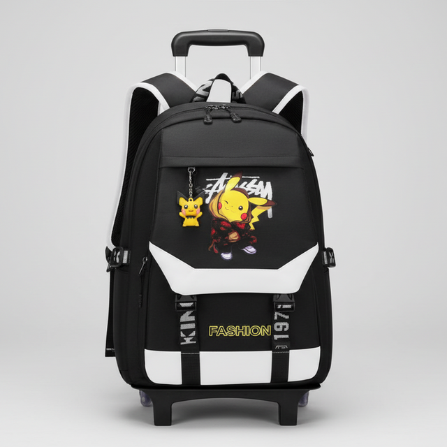 This exciting Pokemon trolley backpack features beloved Pikachu character graphics on a stylish black and white design with detachable wheeled trolley system for easy transport. The innovative stair climbing wheels navigate steps effortlessly while the large capacity interior accommodates books, laptop, and school supplies. Made from waterproof material with padded shoulder straps and multiple compartments, this versatile bag converts from rolling luggage to traditional backpack. Perfect for students, computer users, and travel, this backpack solves the problem of carrying heavy loads while showcasing fun Pokemon style.