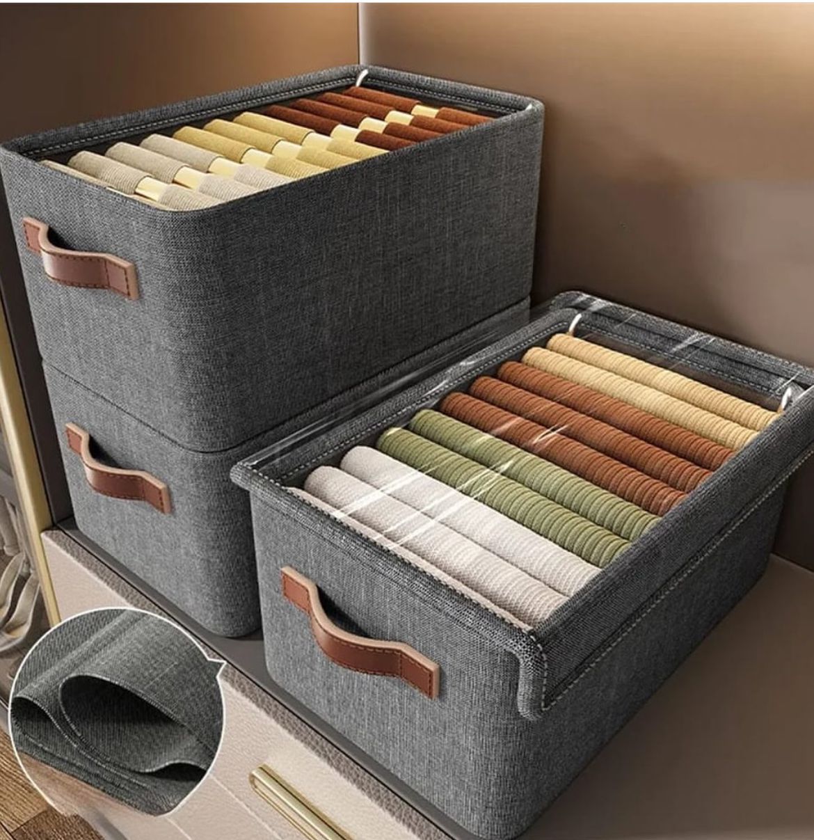 Keep your wardrobe tidy and dust-free with these foldable closet organizers with zippered covers. Designed for efficient storage of clothes, bedding, accessories, and more. The protective lid keeps your items clean, while the neutral grey tone blends beautifully into any closet or room setting.