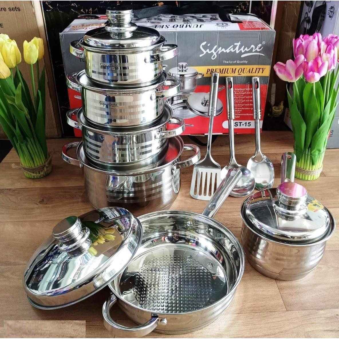- Multiple sizes of cooking pots with lids