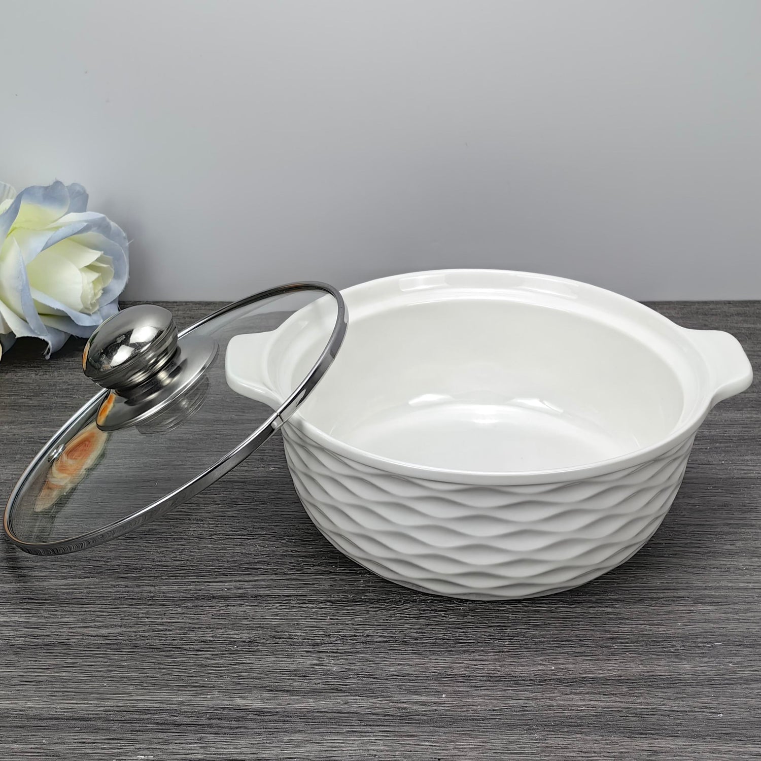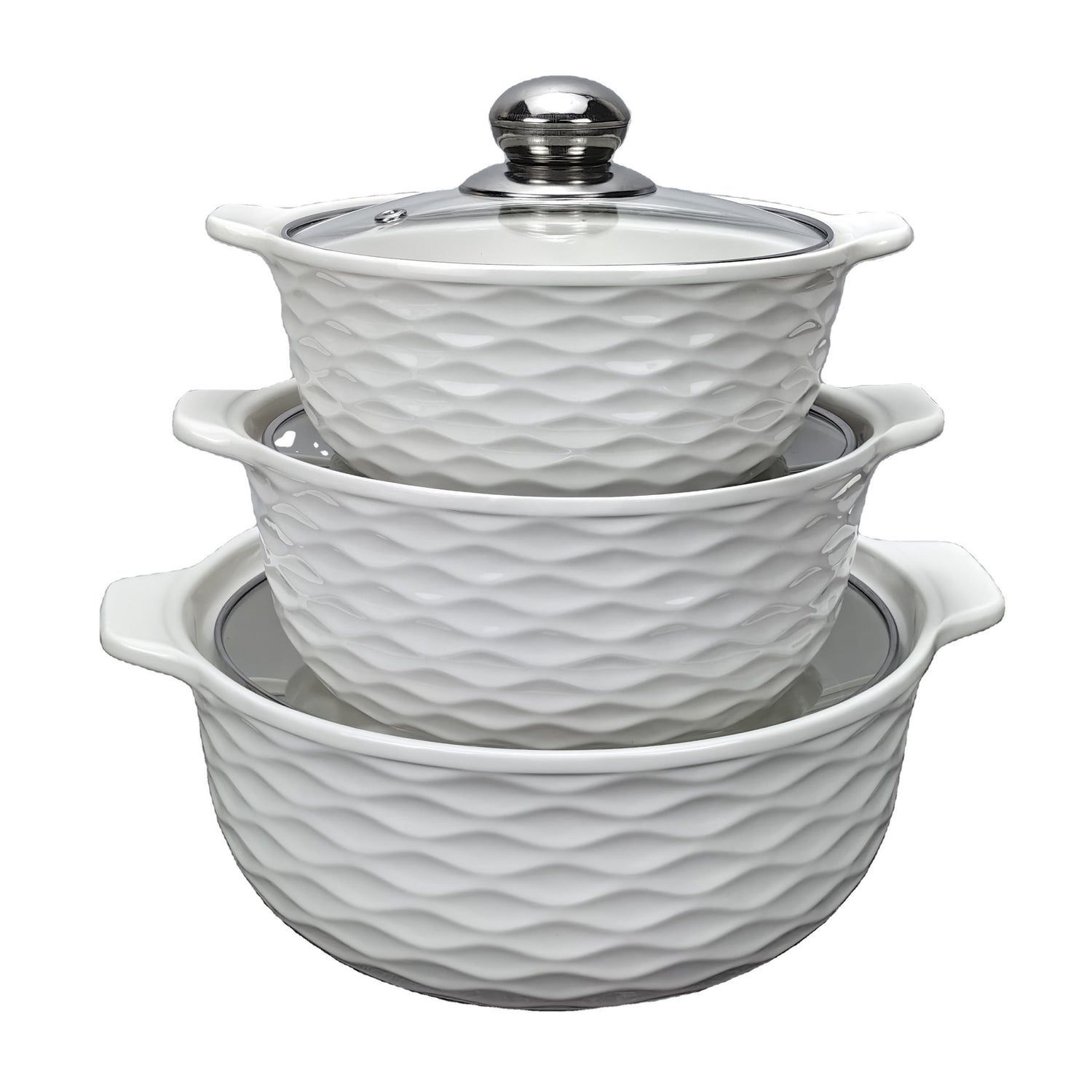 3 Piece White Ceramic Casserole Serving Dishes Set with Tempered Glass Lid Covers | Versatile Cookware Soup Pot and Bowl Set