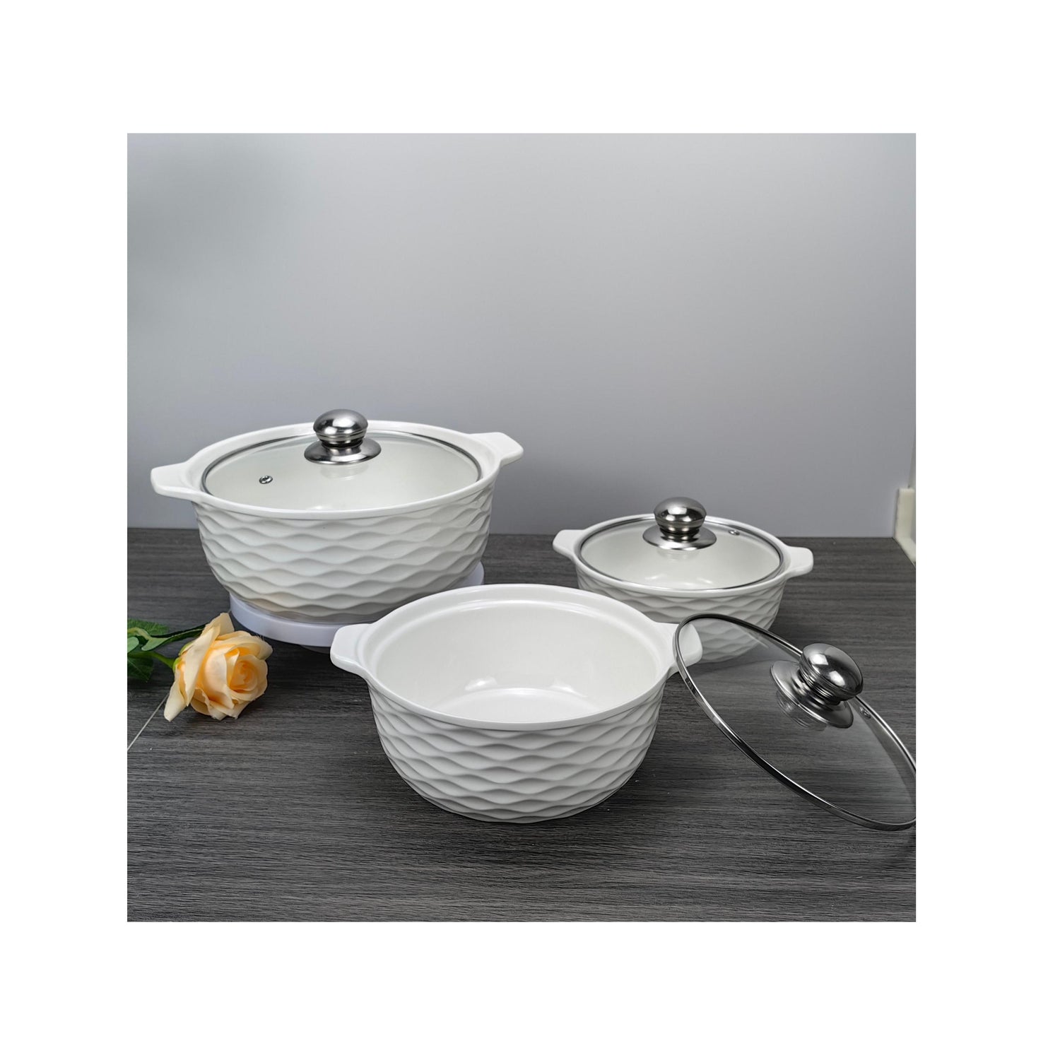 Discover the perfect blend of style and functionality with the 3-Piece Ceramic Casserole Serving Dishes Set. This elegant set includes three beautifully designed casserole dishes, complete with glass covers, making it ideal for serving soups, stews, and other delicious meals. Crafted from high-quality ceramic, these dishes offer excellent heat retention and even cooking, ensuring your culinary creations are served at the perfect temperature.