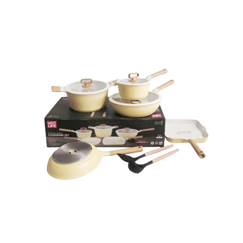 Cook with style and convenience using the UCC Life 10-Piece Nonstick Cookware Set, model 15-UL 10 P. Available in elegant granite and cream finishes, this cookware set features a durable nonstick coating for effortless cooking and cleaning. Designed with an induction-compatible base, it’s suitable for use on both induction cooktops and traditional stoves. This comprehensive set includes pots, pans, lids, cooking shovels, and ergonomic handles for comfortable use, making it a versatile and stylish addition to any kitchen.