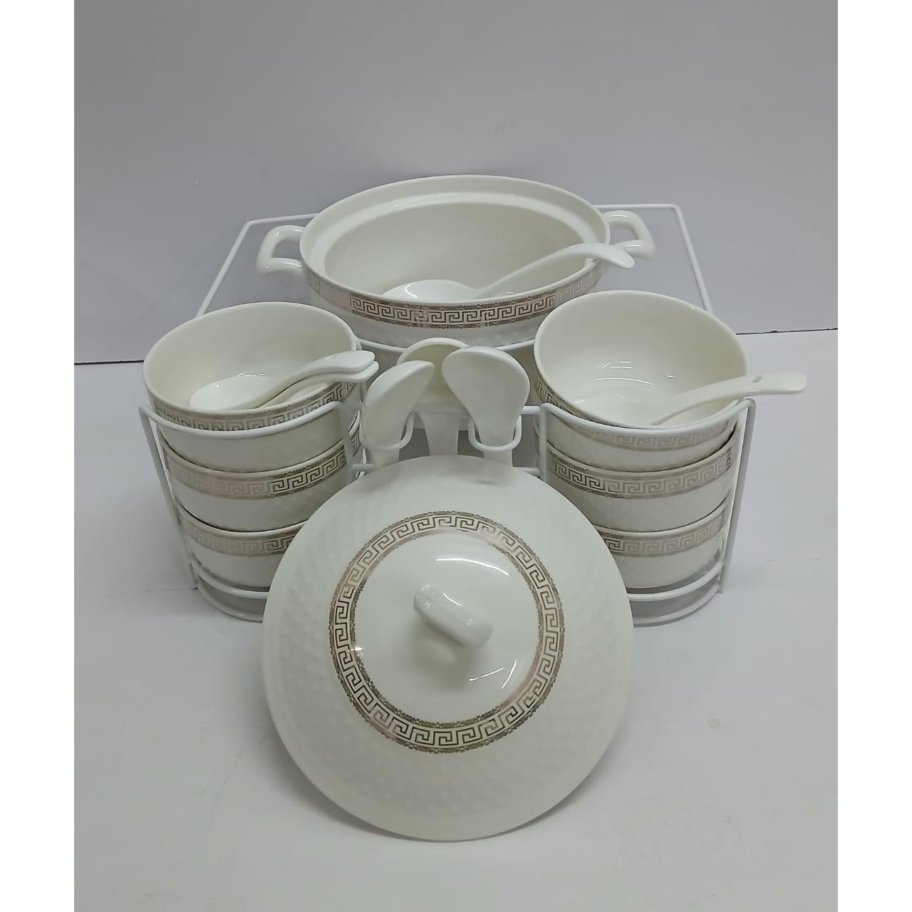 15 Piece White Ceramic Soup Set with Metallic Holder