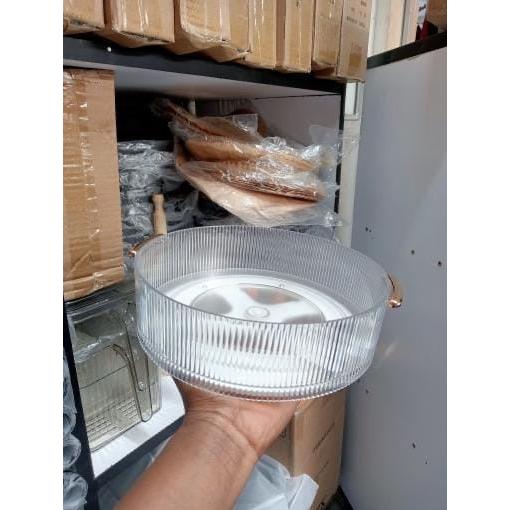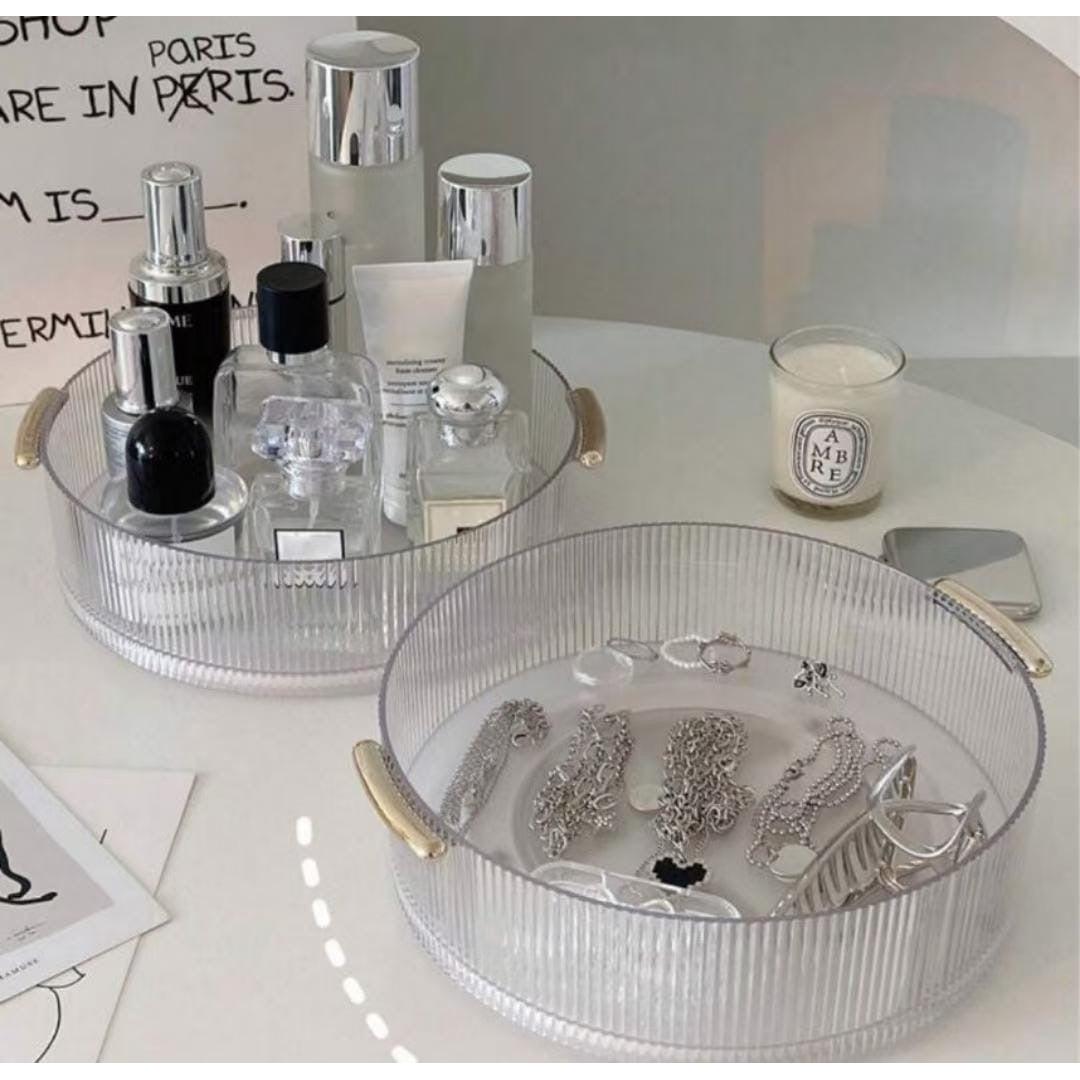 Add a touch of elegance and efficiency to your vanity or kitchen with this single-layer ribbed acrylic Lazy Susan. Designed with smooth 360° rotation and luxurious gold handles, it’s perfect for organizing cosmetics, skincare, spices, or condiments in style.