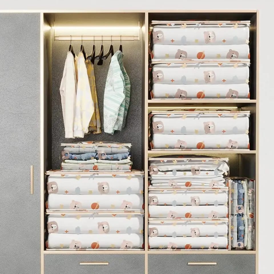 This Space-Saving Storage Bag is perfect for storing quilts, seasonal clothes, and bedding in the bedroom, closet, or under the bed, offering a convenient and durable solution for organizing your home.