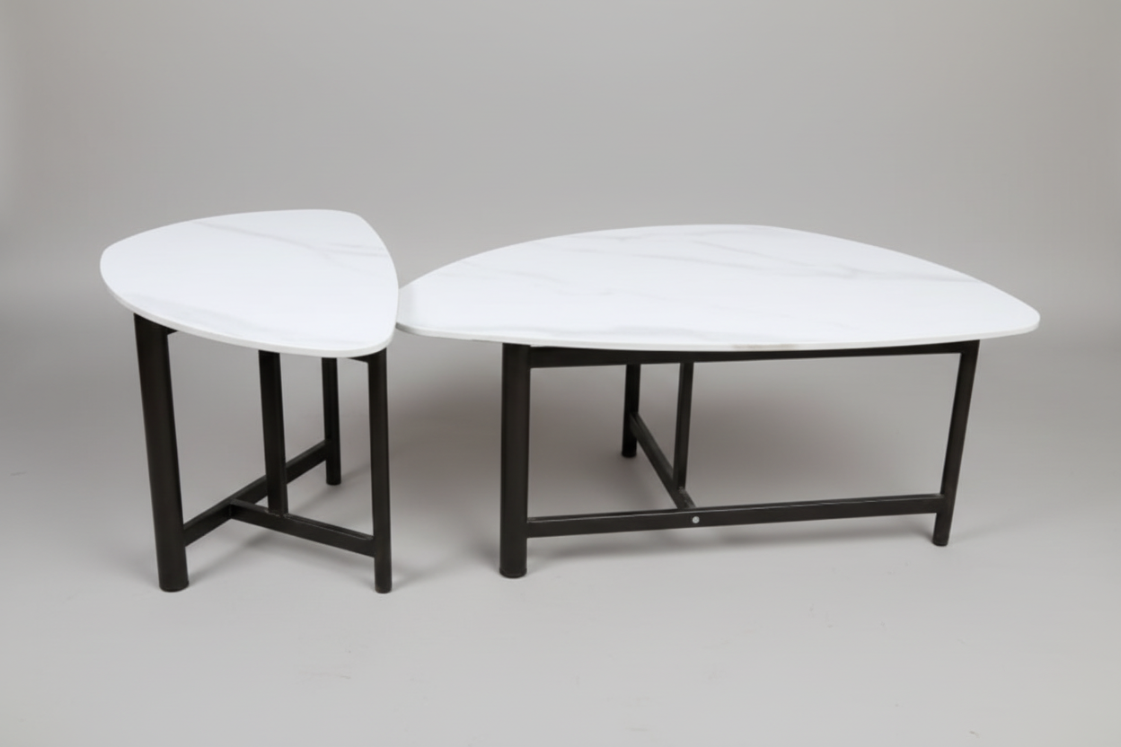 Maximize your living room space with this versatile nesting coffee table set featuring clean white tops and sleek black legs. Perfect for modern homes and apartments, this contemporary set includes two triangular tables that can be used together or separately. The larger table provides ample surface space, while the smaller table nests underneath for space-saving storage or can be pulled out for extra surface area when entertaining. Built with sturdy black metal legs for stability and easy-to-clean white surfaces.