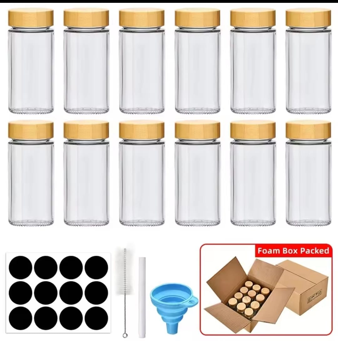 12pc Premium Thick Glass Spice Jar Set – 120ml with Bamboo Lids, Stickers, Funnel & Pen