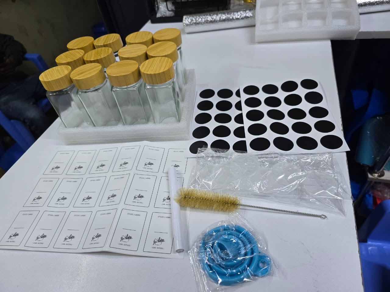 Organize your kitchen like a pro with this 12-piece premium thick glass spice jar set, complete with airtight bamboo lids, adjustable shaker tops, labels, a funnel, and a pen. Designed for both style and function, these 120ml jars are perfect for storing and dispensing all kinds of spices and seasonings.