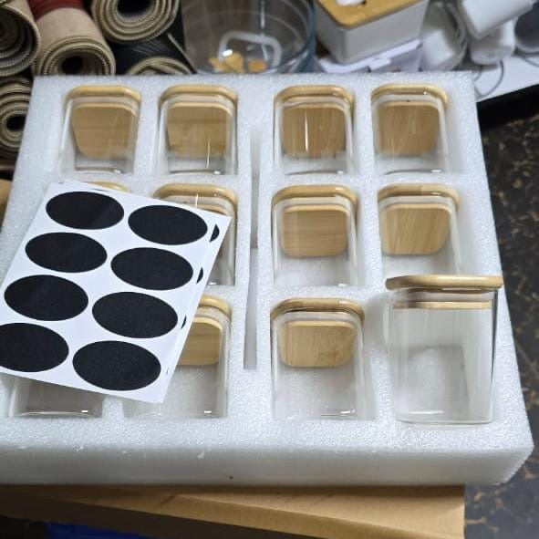 12pc Square Glass Spice Jar Set – 300ml with Bamboo Lids, Stickers & Pen