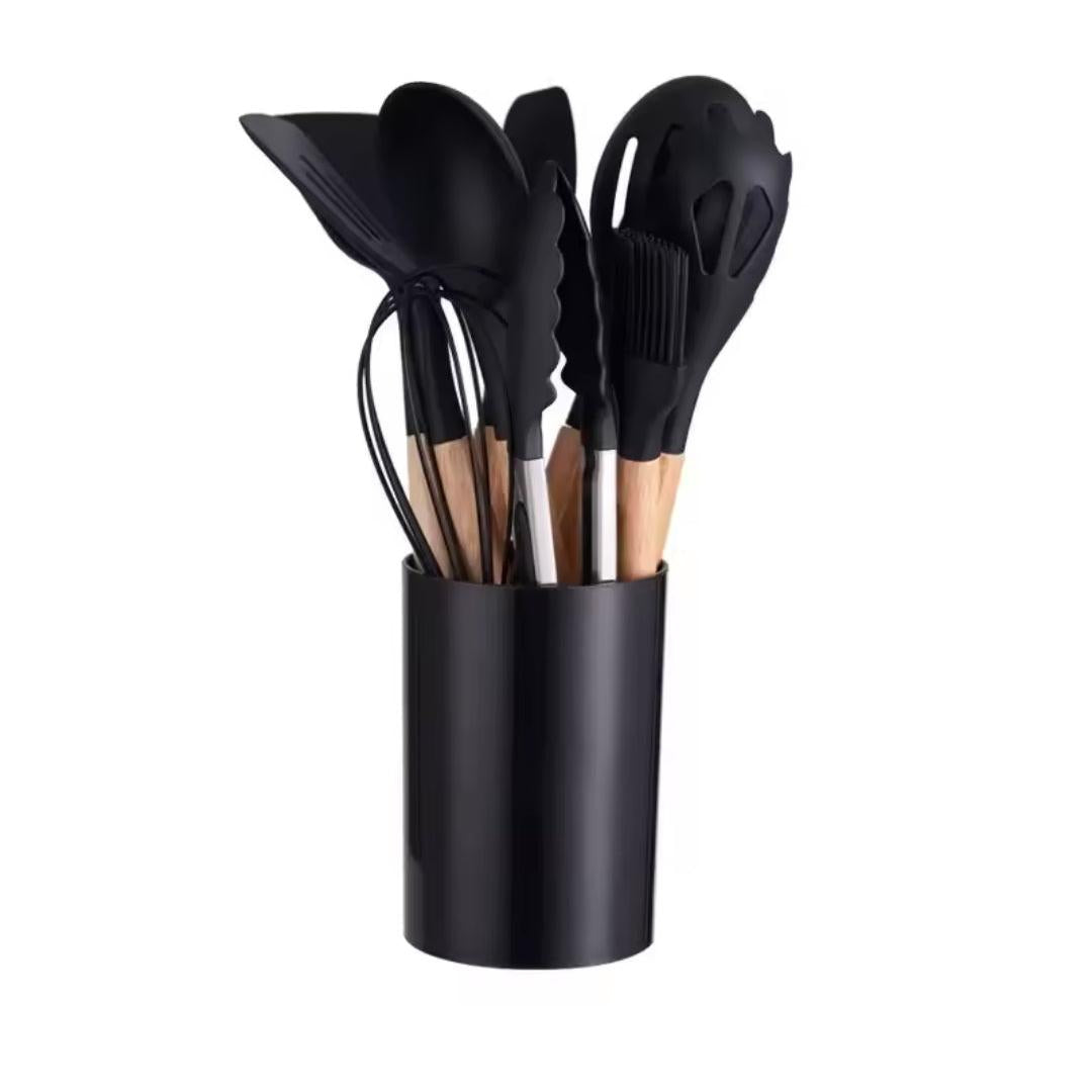 - Upgrade your kitchen with this 12-piece silicone spoon set featuring heat-resistant wooden handles and a holder for easy storage. Designed for durability and convenience, these spoons are easy to clean and safe for all cookware types.