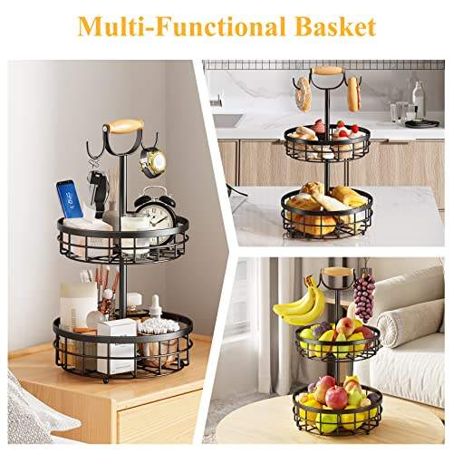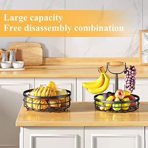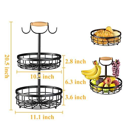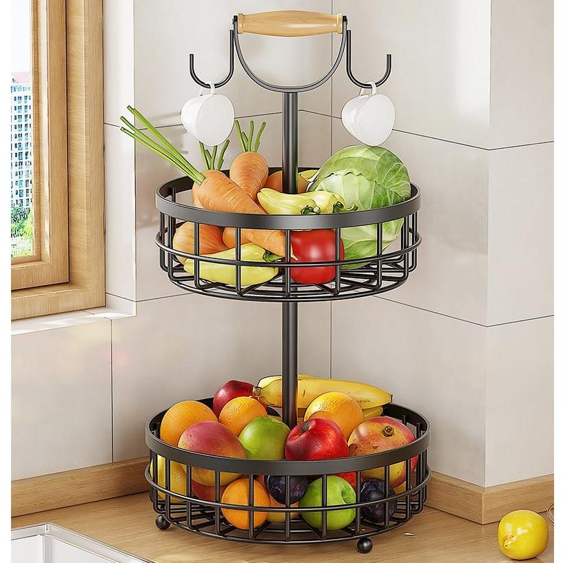 2 Tier Detachable Nordic Fruit & Vegetable Rack with Dual Banana Holder | Carbon Steel & Wood Handle
