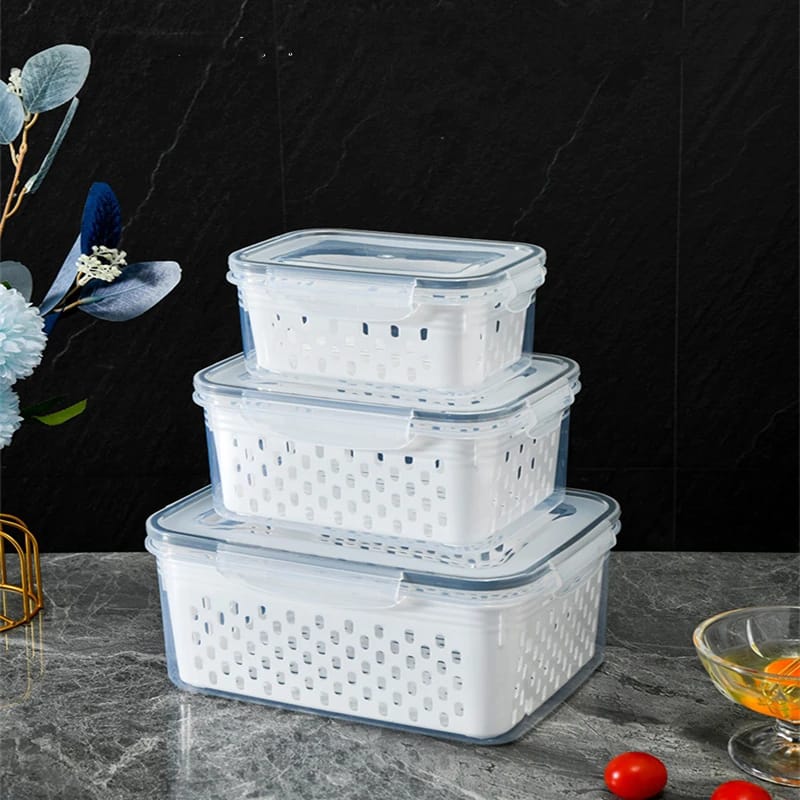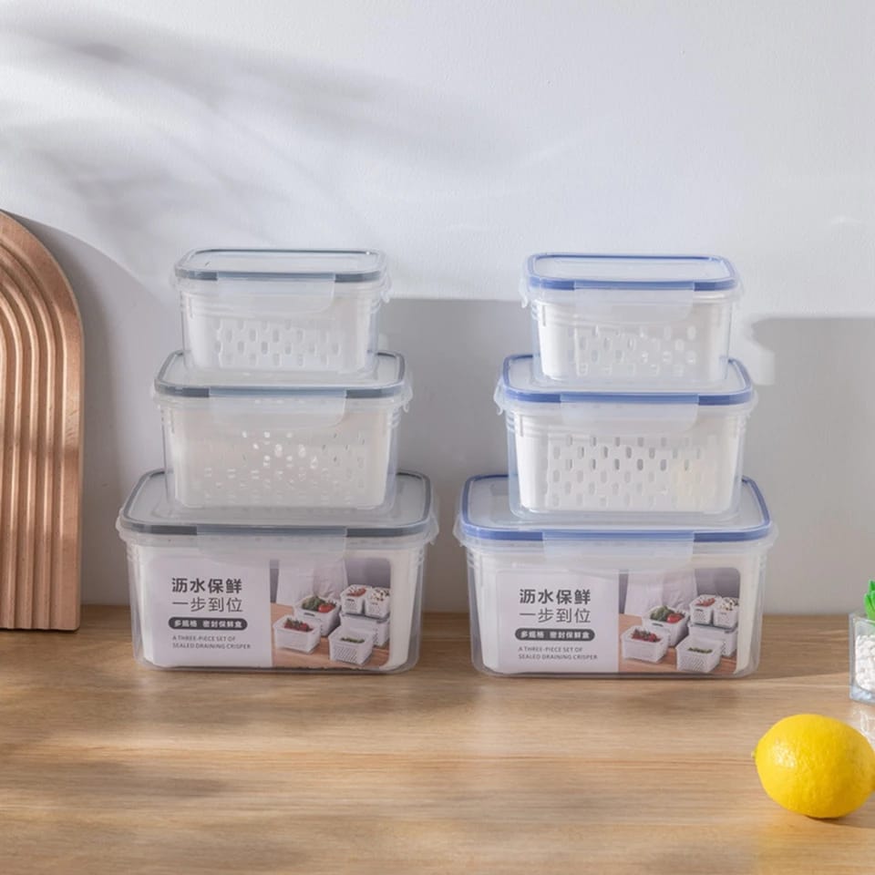 3 Piece Double Drain Basket Set Microwave & Refrigerator Storage Container for Fruits & Vegetables