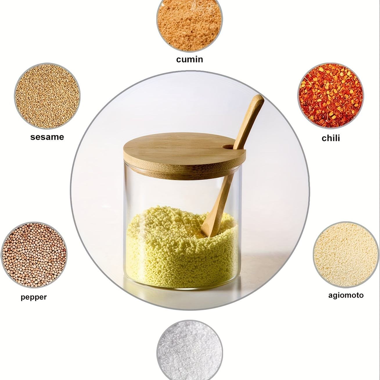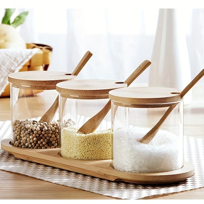 - Included: 3 glass spice jars with bamboo lids, wooden tray, and spoons