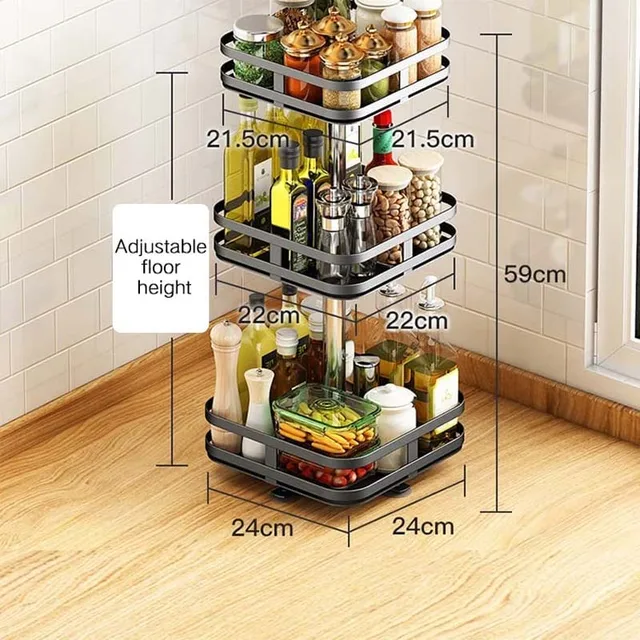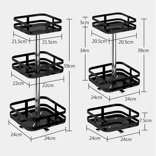 Maximize your kitchen storage with the 3 Tier Square Metallic Rotating Storage Rack. Measuring 24 x 24 x 59 cm, this sleek black stainless steel rack is designed to efficiently hold spice jars and condiments, making it a perfect addition to any kitchen cupboard. Featuring a rotating design for easy access, it also includes an anti-skid pad at the bottom to enhance stability and prevent scratches on your countertop. This rack is both moisture-proof and rust-proof, ensuring durability and long-lasting use.