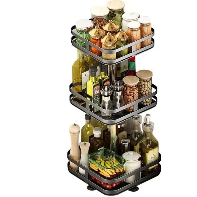 Multifunctional 3 Tier Square Metallic Rotating Storage Rack | Black Stainless Steel Condiment Organizer for Kitchen