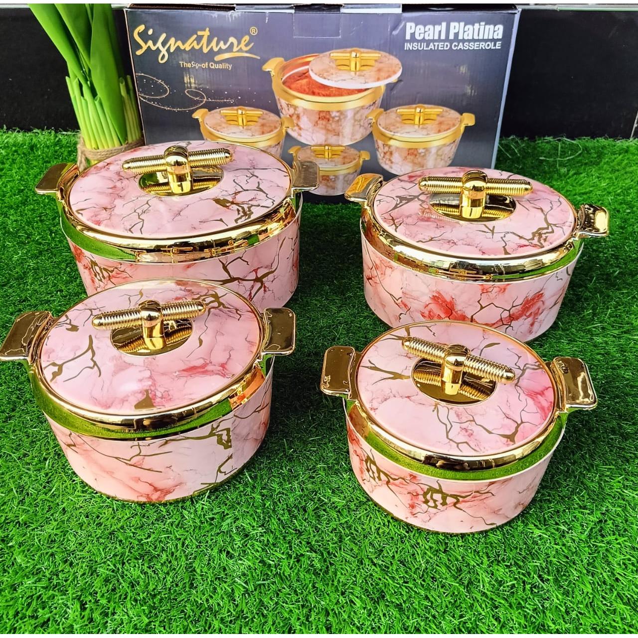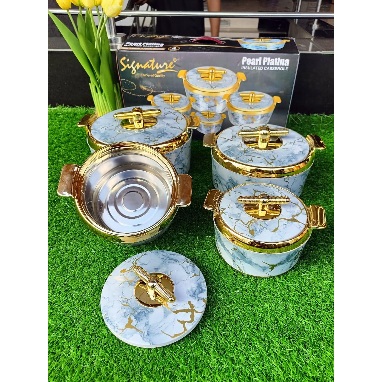 The Pearl Platina Hotpots Set combines style, convenience, and functionality to keep your meals hot for hours. This 4-piece set is available in elegant color options of Blue, Grey, Pink, and Orange, perfect for complementing any dining decor. With a range of sizes from 700ml to 2500ml, these insulated hotpots are ideal for serving and storing a variety of dishes, from soups and stews to rice and curries.