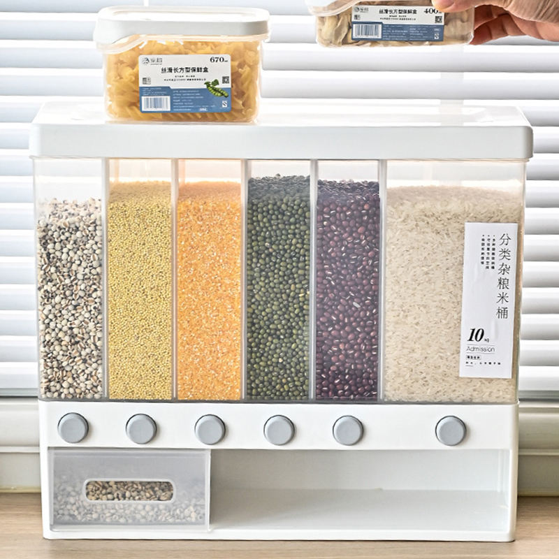Store and organize your cereals and grains effortlessly with this 6-compartment cereal dispenser. Made from environmentally friendly, non-toxic PP material, it ensures safe food storage. Equipped with movable partitions, it allows customization based on the grain size. Perfect for storing rice, cereals, or other dry goods.