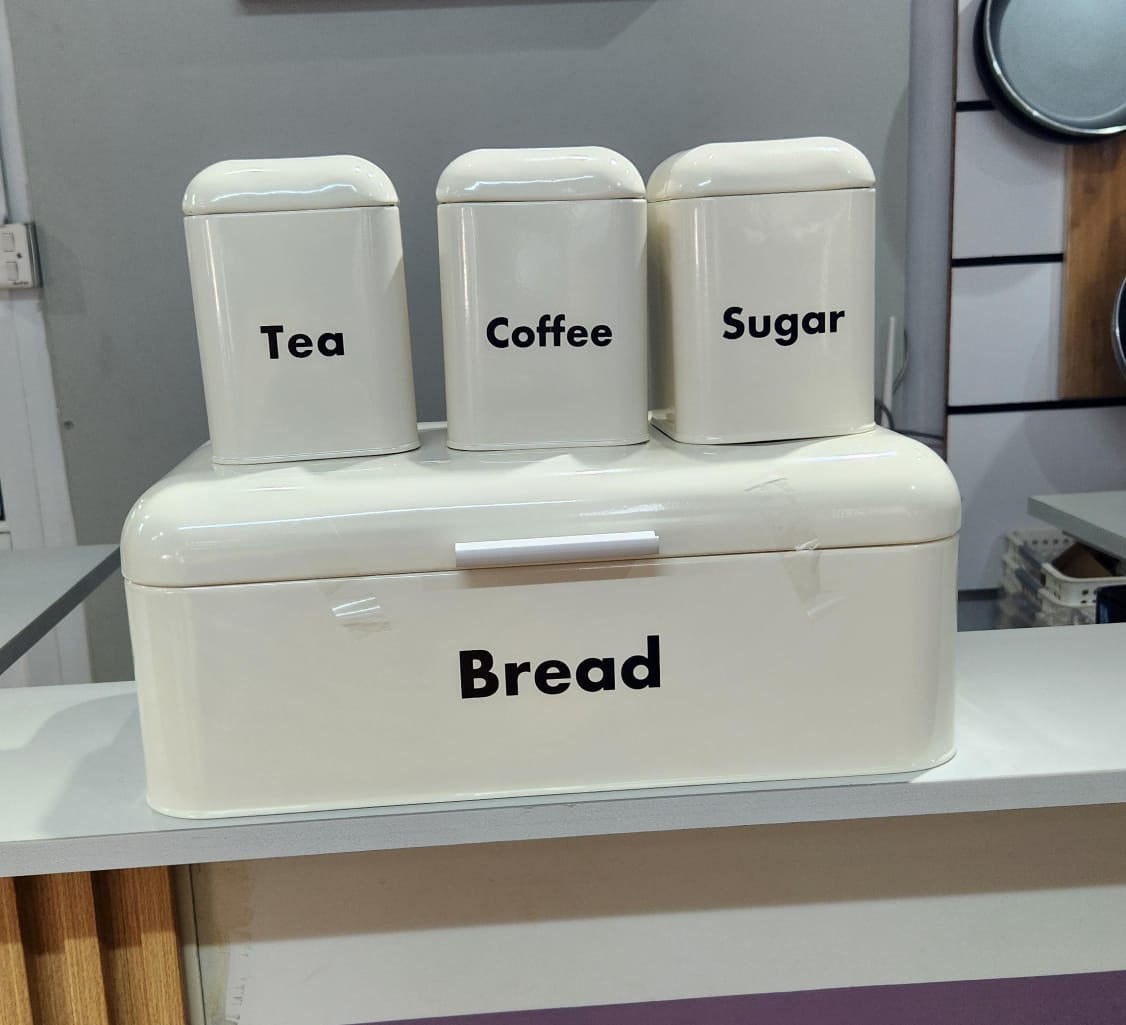 Upgrade your kitchen storage with this large-capacity alloy bread bin paired with three matching canisters. Featuring a sleek finish in white or black and durable construction, it’s perfect for keeping bread, tea, coffee, sugar, and snacks fresh while adding a modern touch to your countertop.