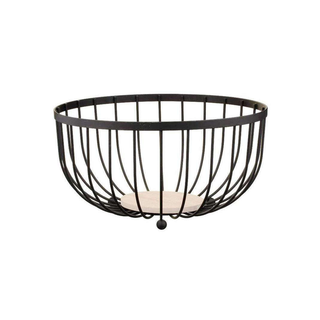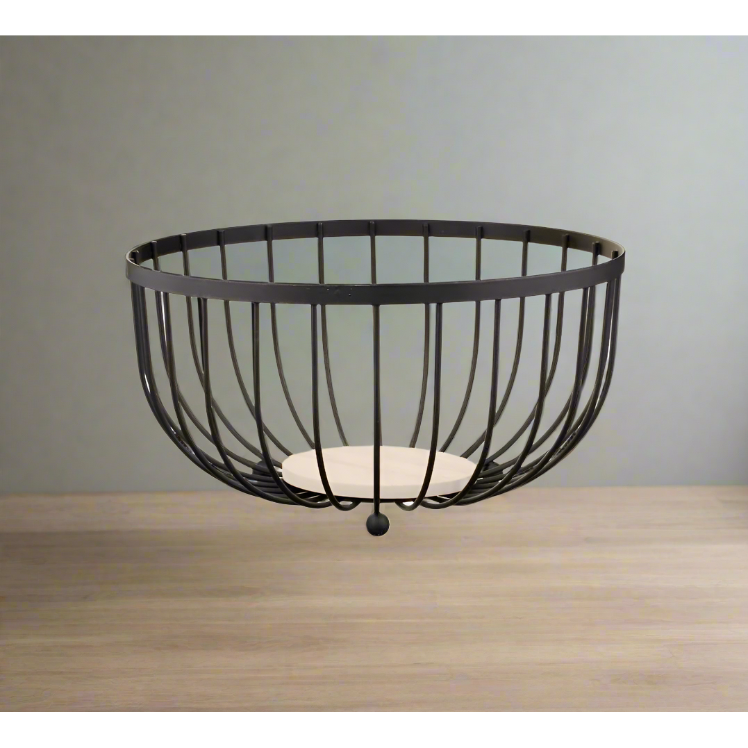 A stylish black metal fruit basket with a sturdy wooden base, designed for displaying fruits or other items. Its modern and elegant design enhances kitchen or dining decor.