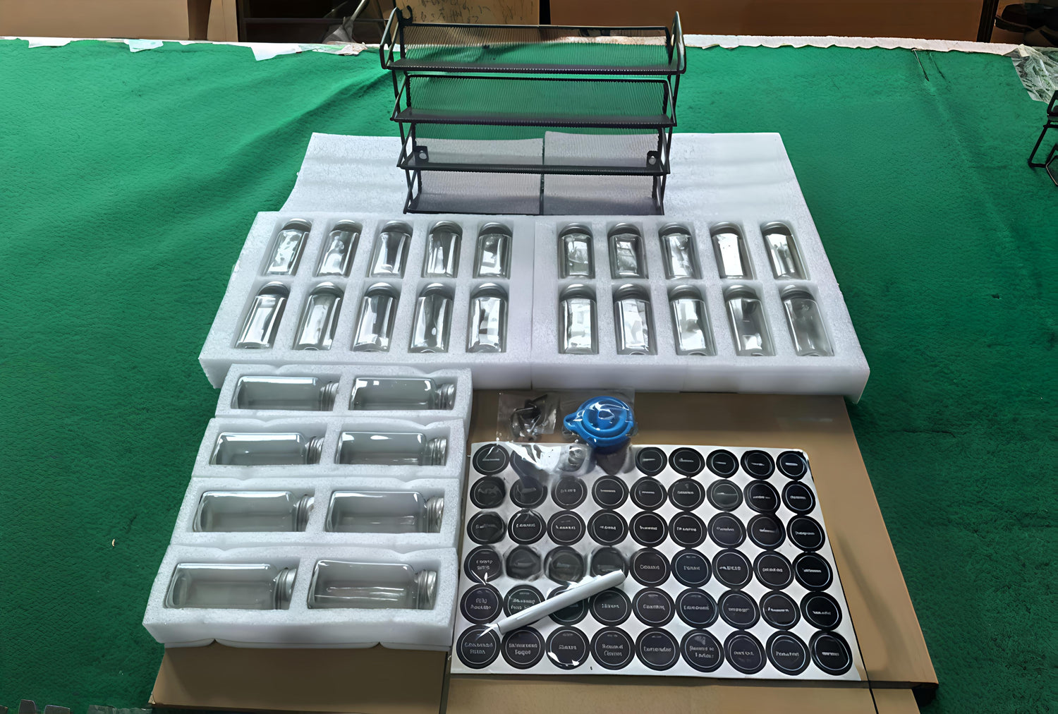 ● Material: Glass Jars + Metallic Rack + Plastic Funnel