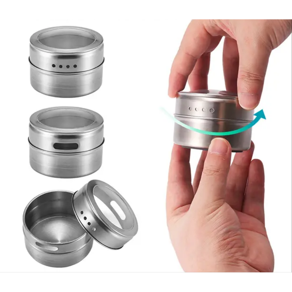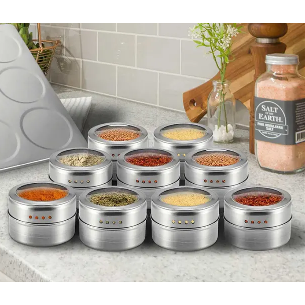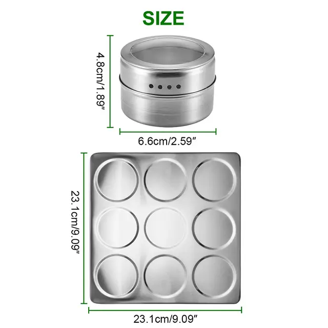 Organize your kitchen spices effortlessly with this Magnetic Cruet Condiment Spice Jar Set. Featuring 9 stainless steel jars with a magnetic bottom design, each jar sticks firmly to the spice rack for easy access. The rotating lid allows you to regulate the hole size for precise seasoning and provides a hermetic closure to keep contents fresh. Perfect for storing spices, salt, pepper, tea, and more, this set combines practicality with modern style.
