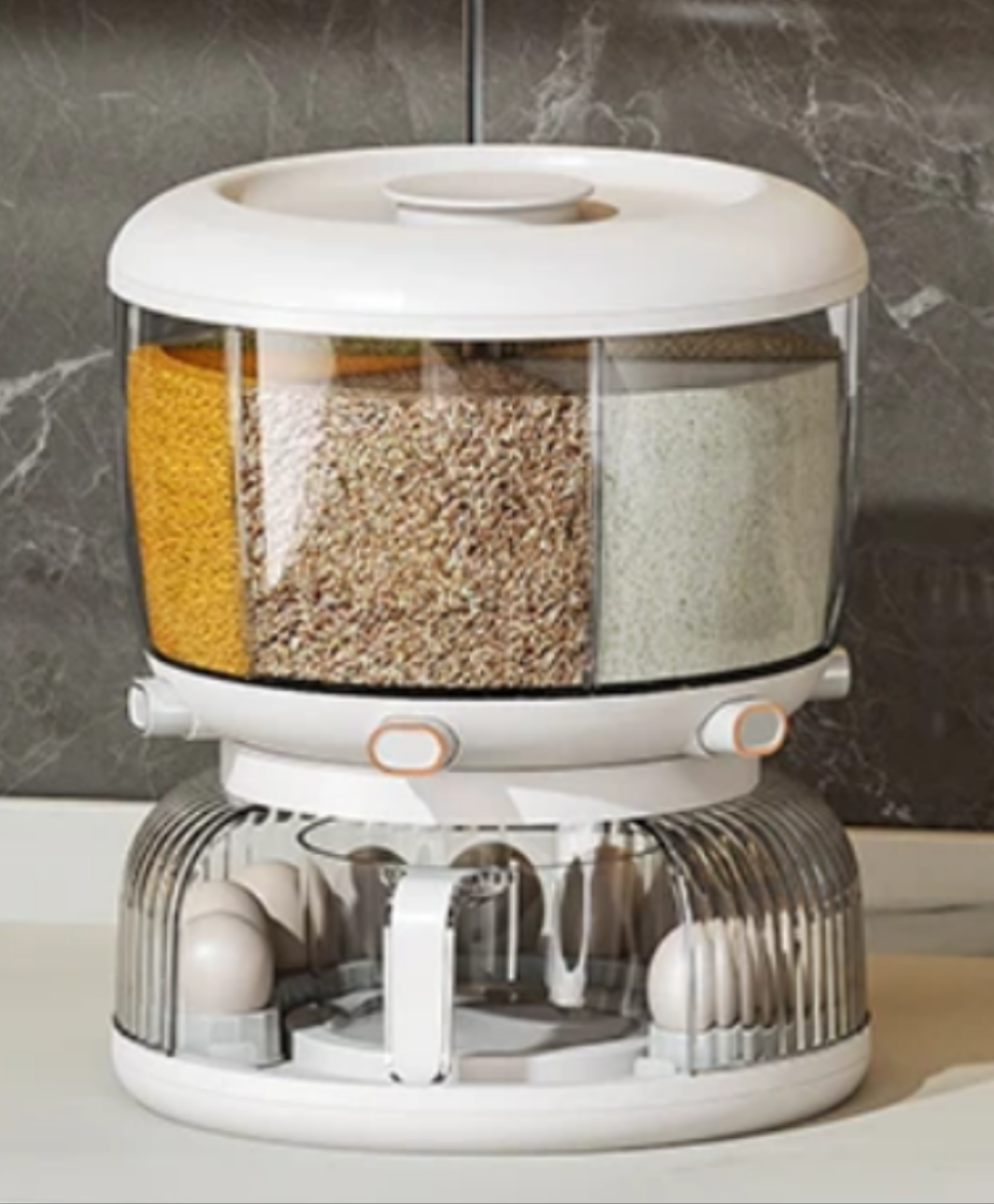 Partitioned Cereals Dispensers with Egg Holder 12kg Capacity Airtight Rotating Storage