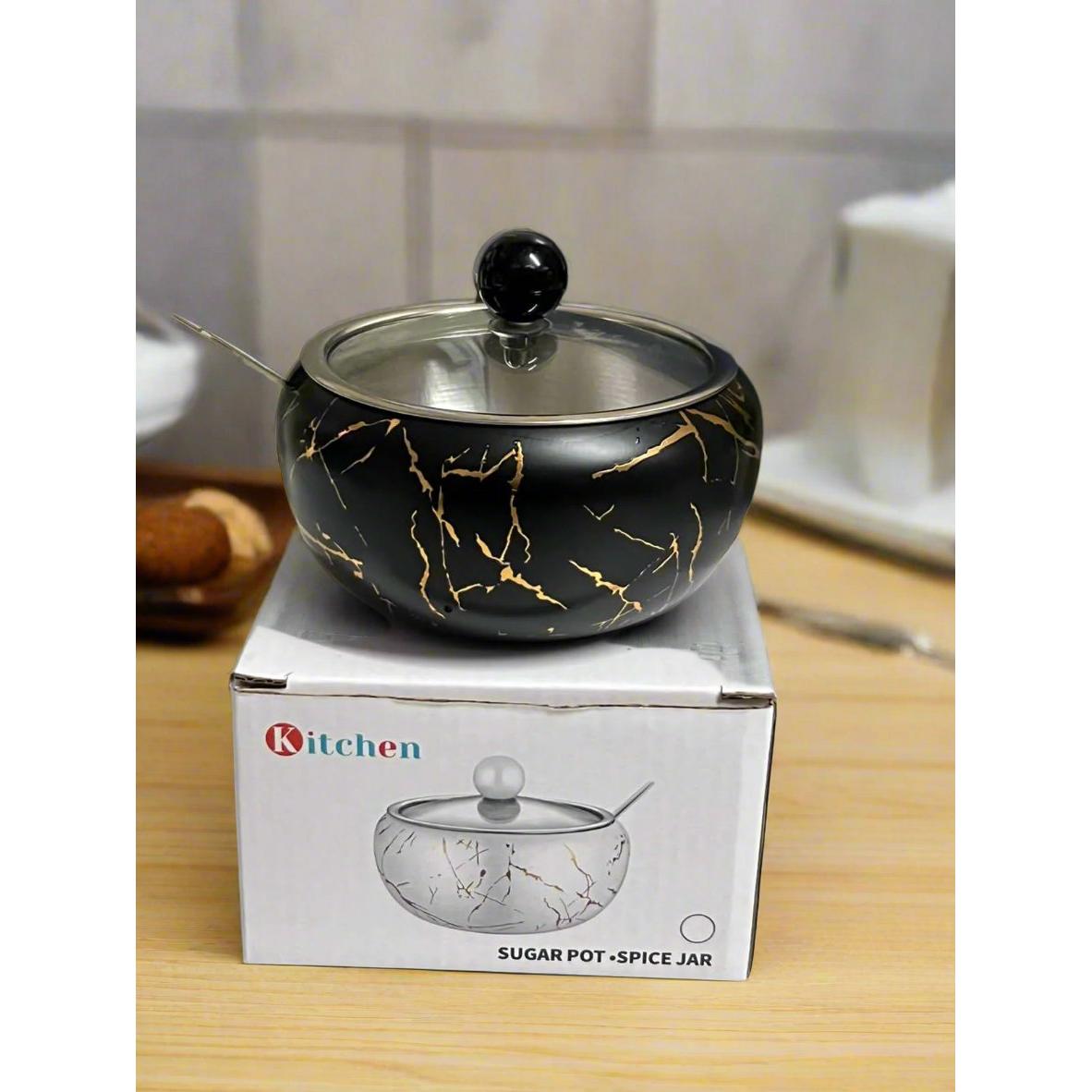 Stainless Steel 440ml Capacity Sugar Dish with Matching Lid & Spoon | Sugar Pot | Spice Jar| Kitchen Storage | Black