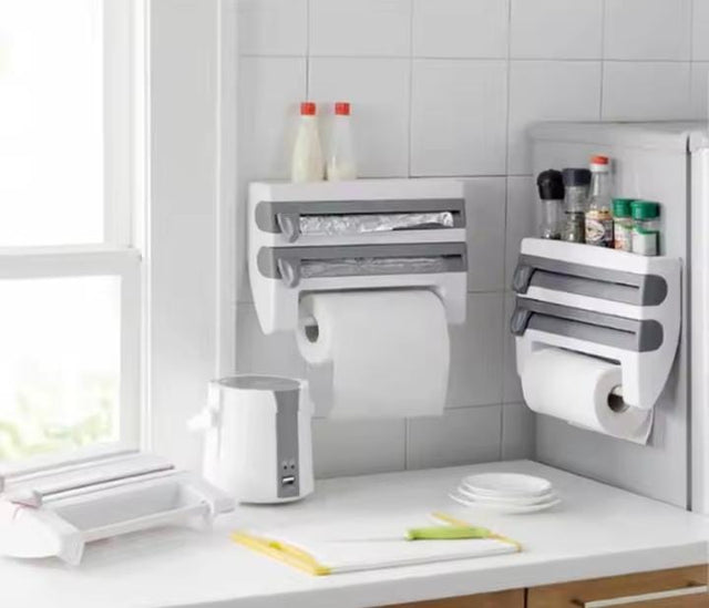 Keep your kitchen or bathroom neatly organized with this triple paper dispenser. Made from durable plastic, it features multiple slots for foil, cling film, and paper towels, with built-in cutters for easy tearing. Stylish in white with grey or beige accents, it’s a space-saving essential.