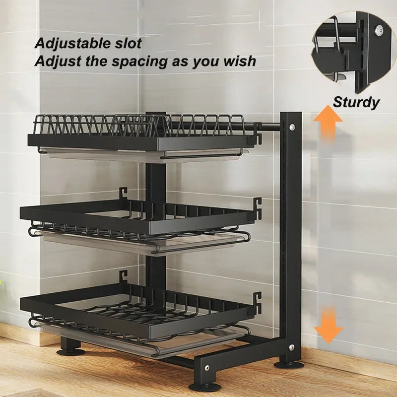The 3-layer adjustable dish rack is constructed from durable carbon steel with a sleek black finish. It includes drain trays, a chopping board, and cutlery holders. This versatile rack can be used as a free-standing unit or wall-mounted.