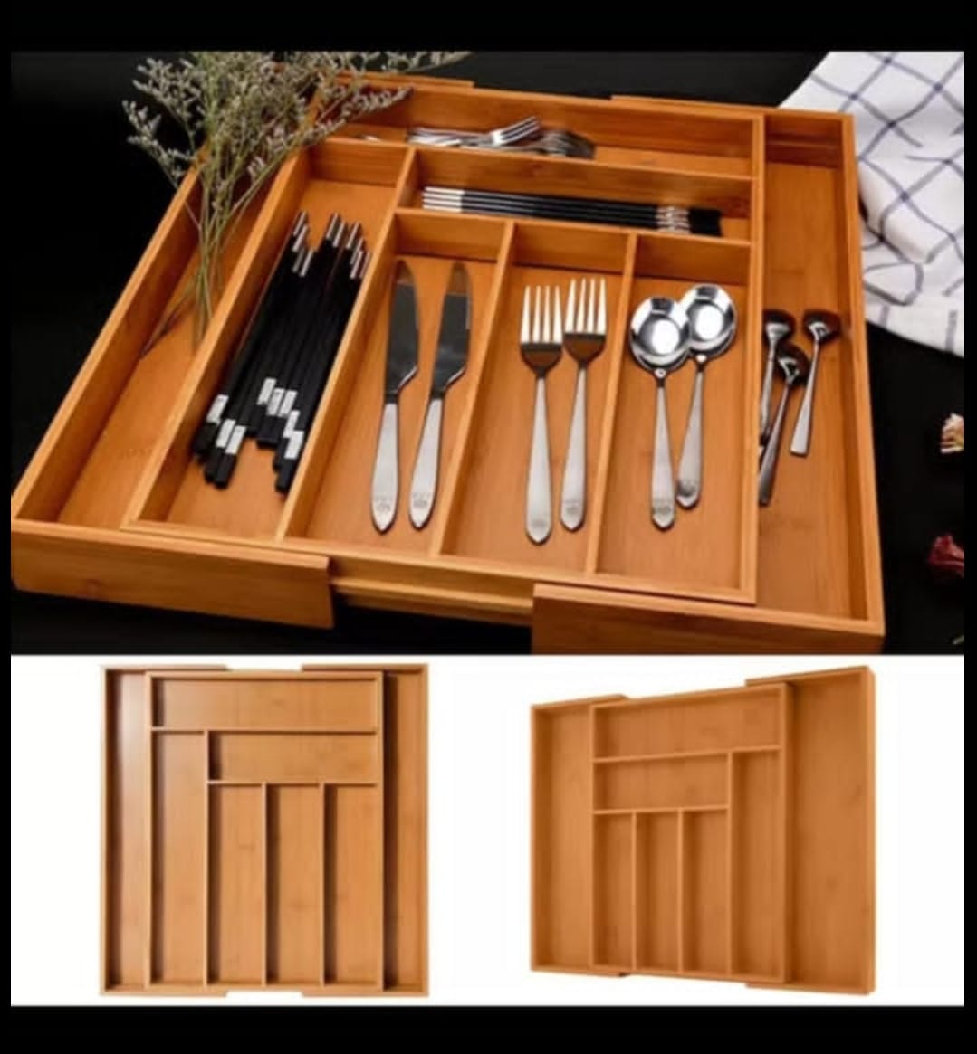 Organize your kitchen drawers neatly with this expandable bamboo cutlery organizer. Its adjustable design allows you to customize the width to fit different drawer sizes, while multiple compartments keep utensils, cutlery, and kitchen tools in order.