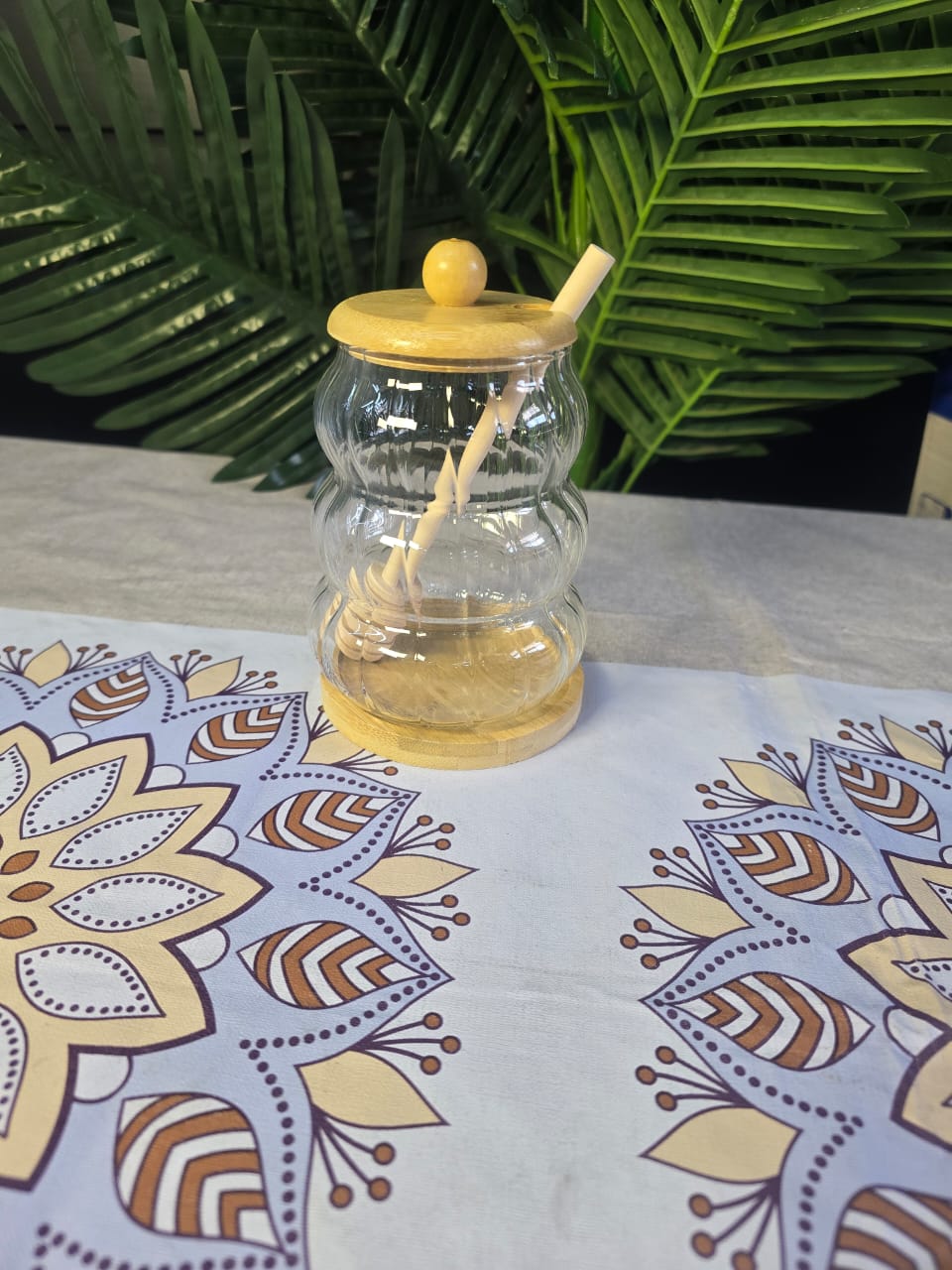 Add a touch of charm to your kitchen or breakfast table with this elegant honey dispenser jar. Crafted from clear glass and paired with a natural bamboo lid, base, and dipper, it’s the perfect blend of style and functionality for everyday use.
