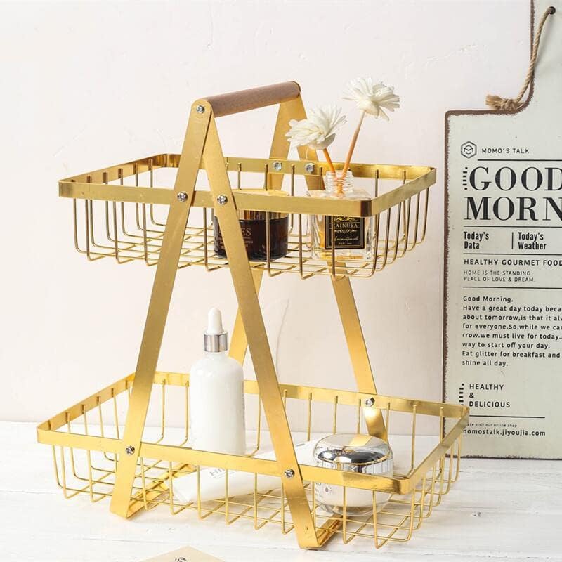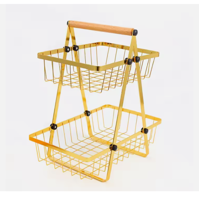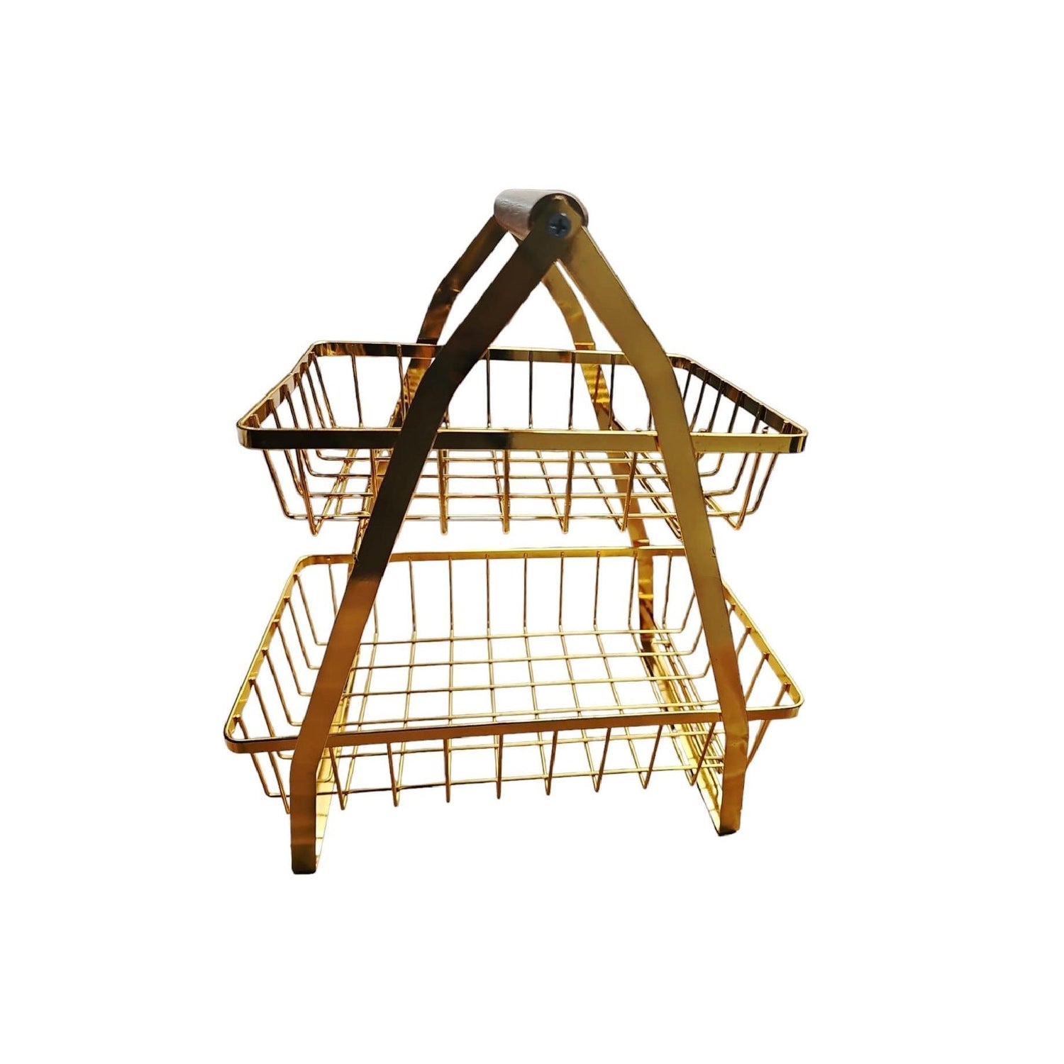 Elegant two-layer rack with a sleek V-shaped design and golden finish. Crafted from metal with a gold-colored coating. Ideal for organizing or showcasing items in kitchens, bathrooms, or living rooms.