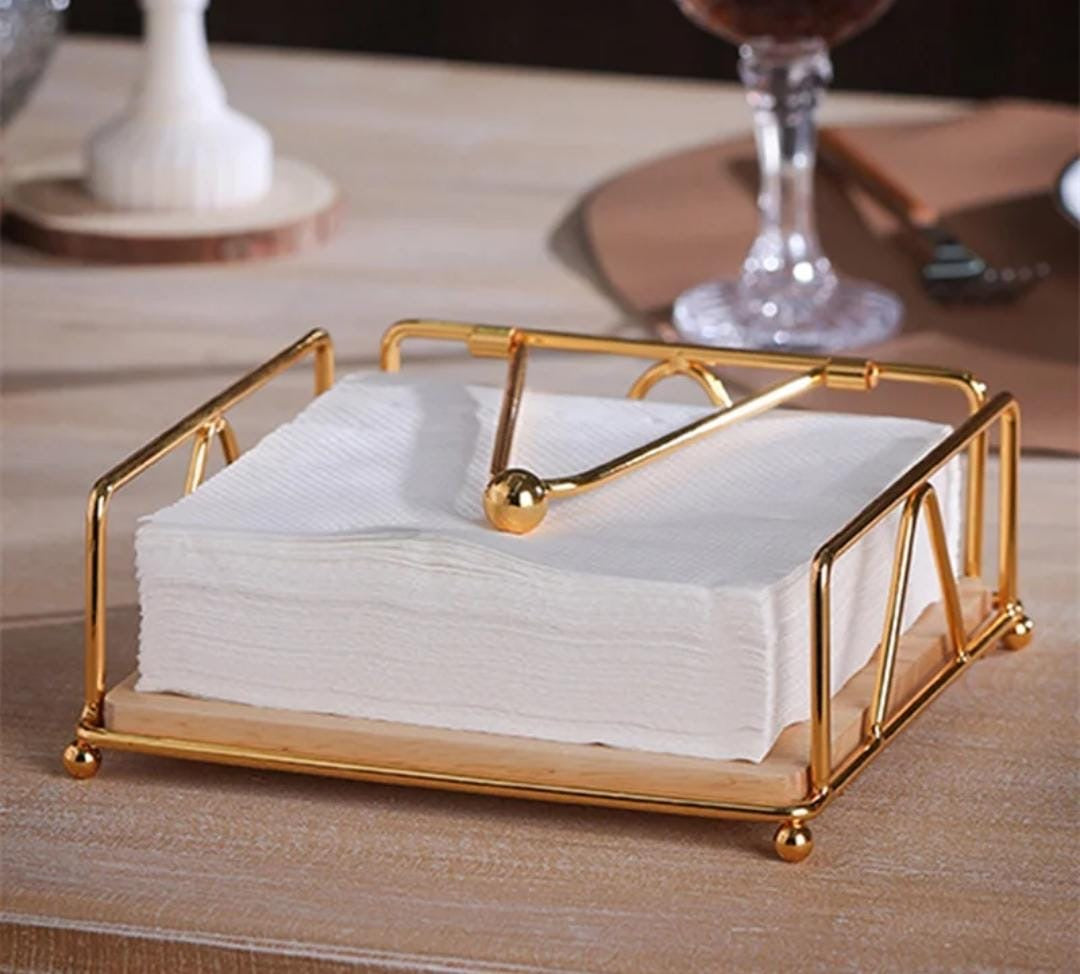 Elevate your dining experience with this luxury serviette holder featuring a sleek metallic frame and a natural bamboo base. Its modern design adds style to your kitchen, dining table, or countertop while keeping napkins neatly in place with a weighted arm.