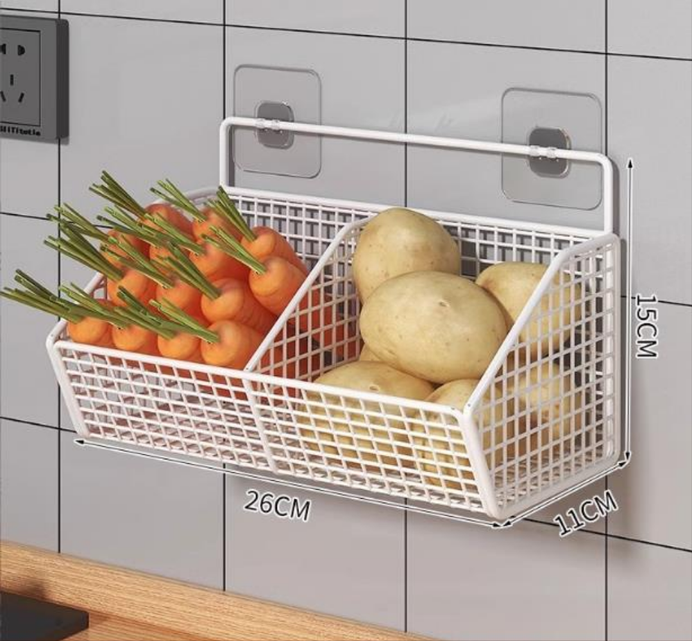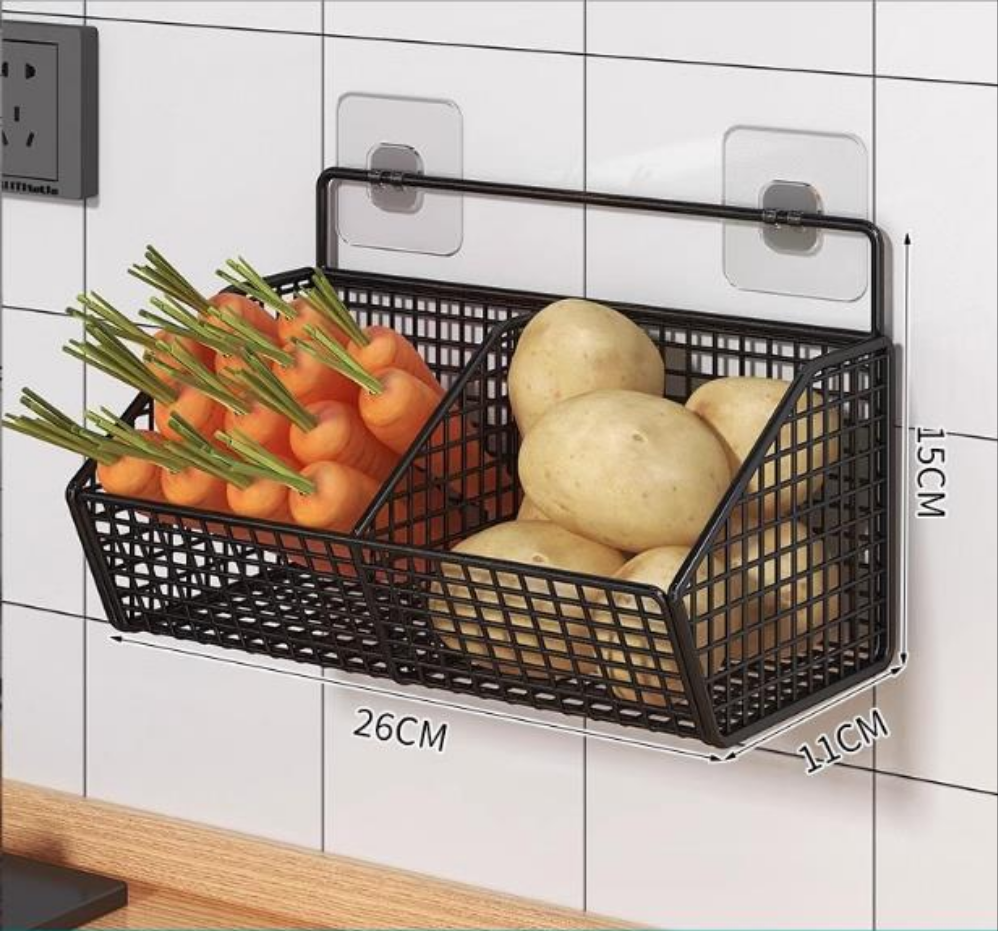 Keep your kitchen tidy and your essentials within reach with this durable wall-mounted metal storage basket. Ideal for storing onions, garlic, spices, and small vegetables, it adds convenience and rustic charm to your kitchen space.