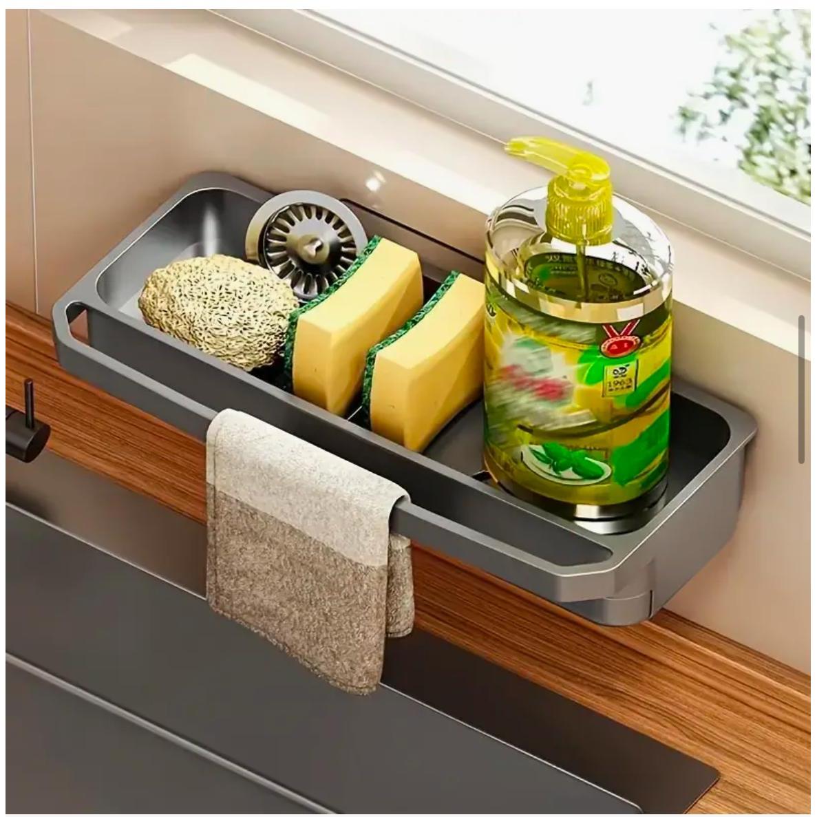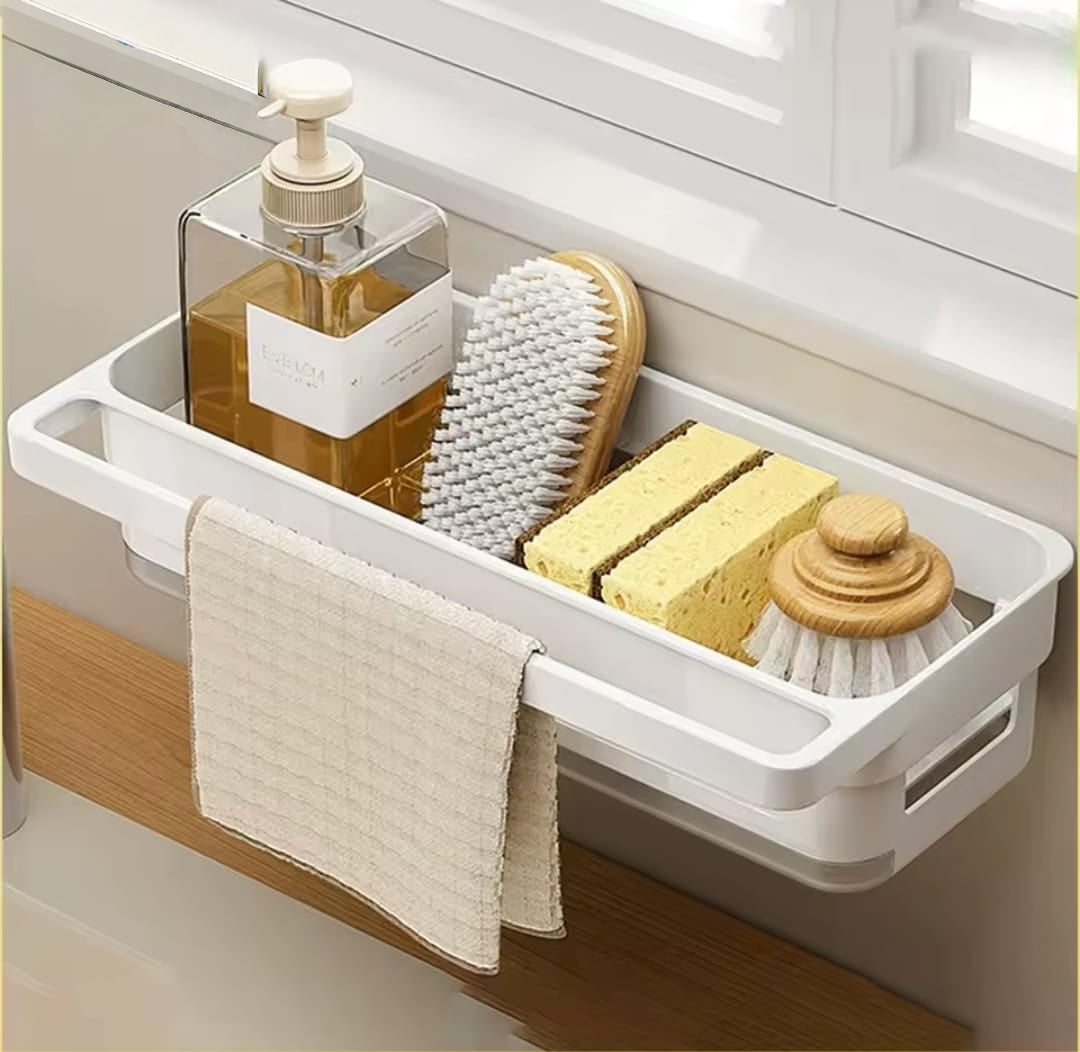 "wall-mounted sink caddy, sink organizer with drip tray, no drill sink caddy, rustproof sink organizer, kitchen sink storage solution"
