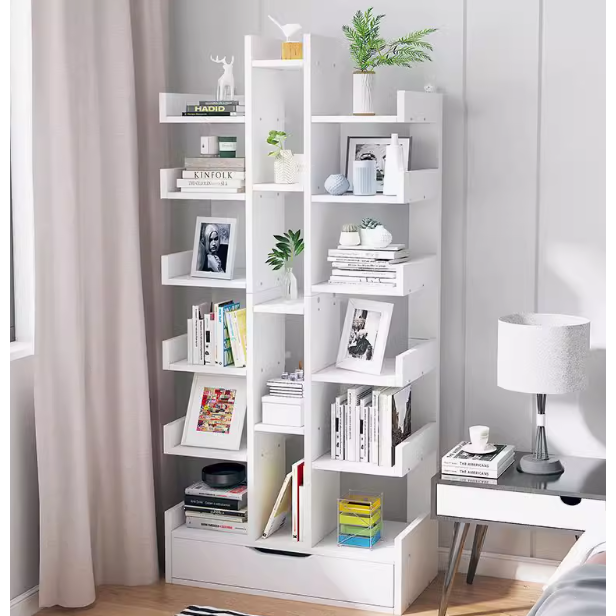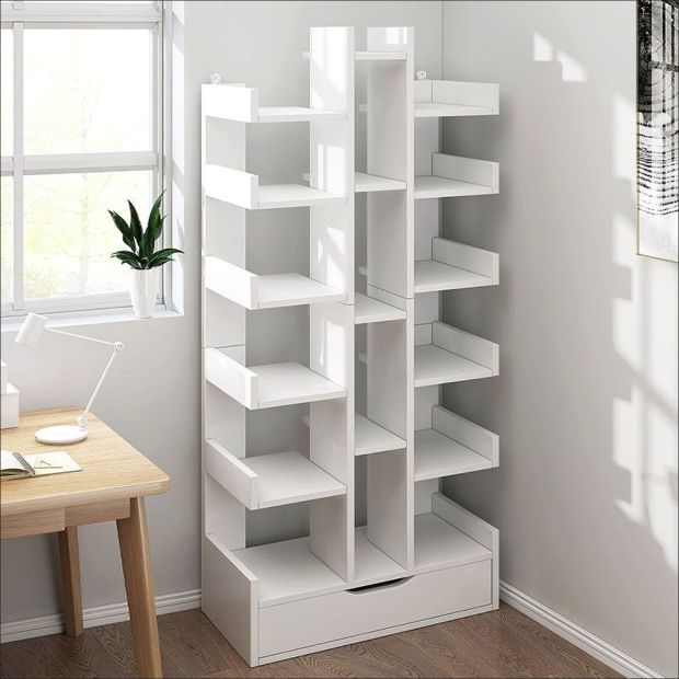 - Design: Ladder bookshelf with multiple storage layers and a bottom drawer