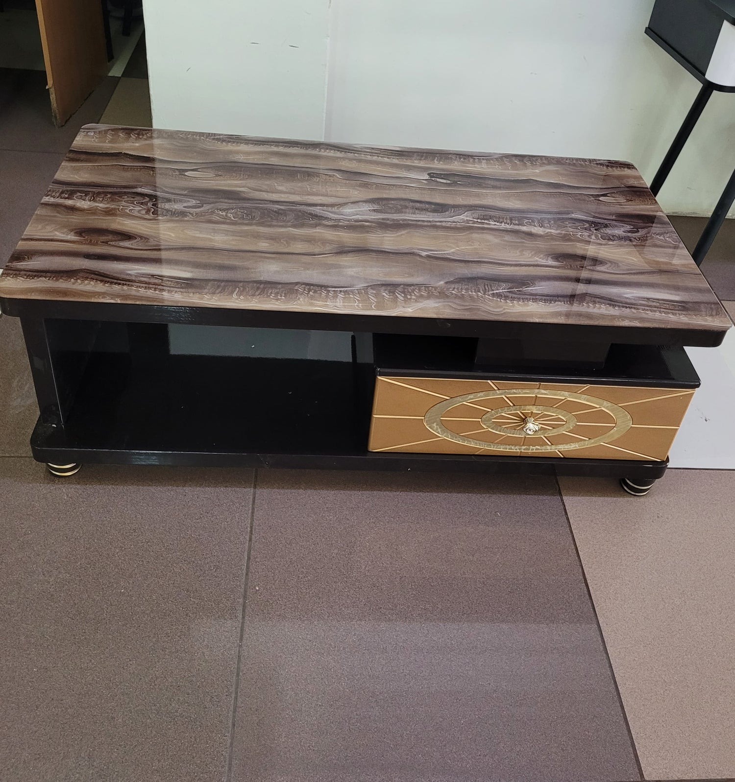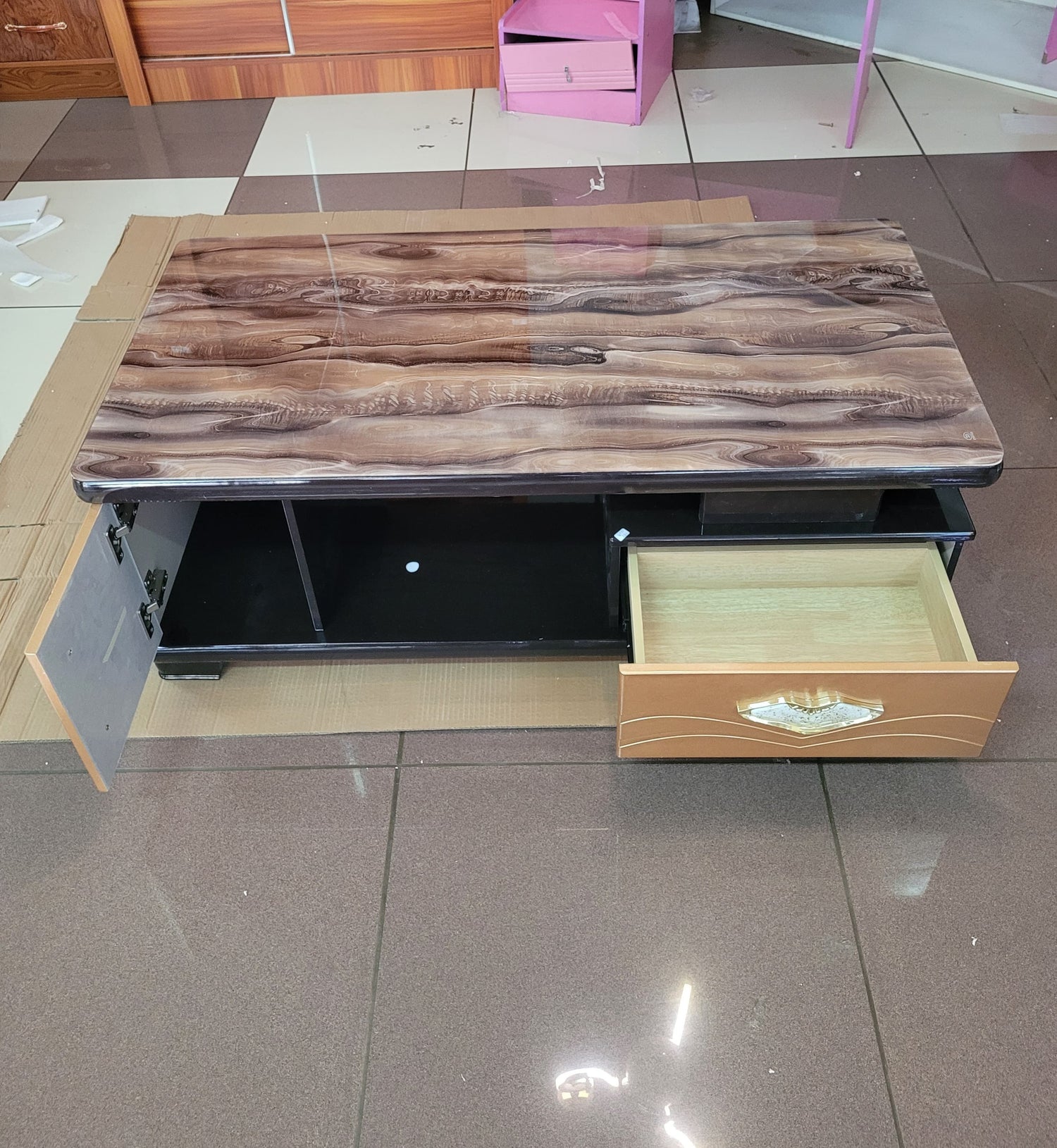 A modern glass-top coffee table with wood-style finish, built for both elegance and function. Includes a pull-out drawer, side cabinet, and open shelf for organized living room storage.
