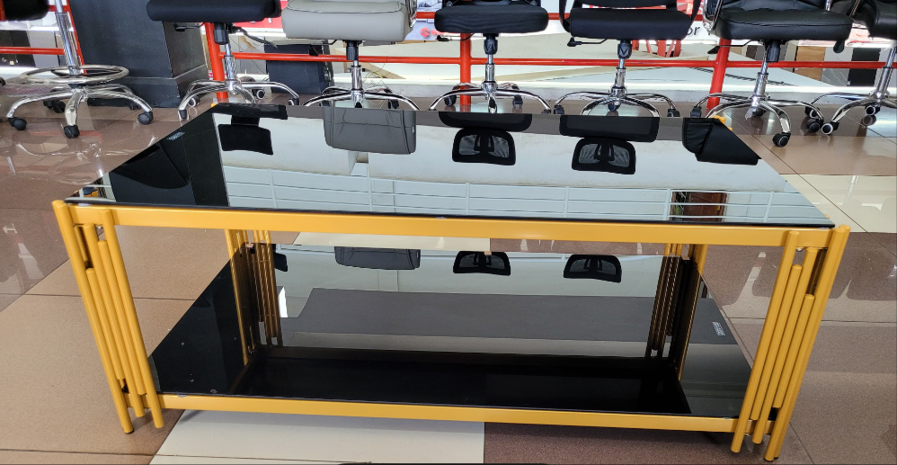 Add a modern touch to your living room with this elegant glass top coffee table. Designed with a sleek golden frame and black tempered glass, it combines style with functionality. The lower shelf provides extra space for organizing or displaying decorative items.