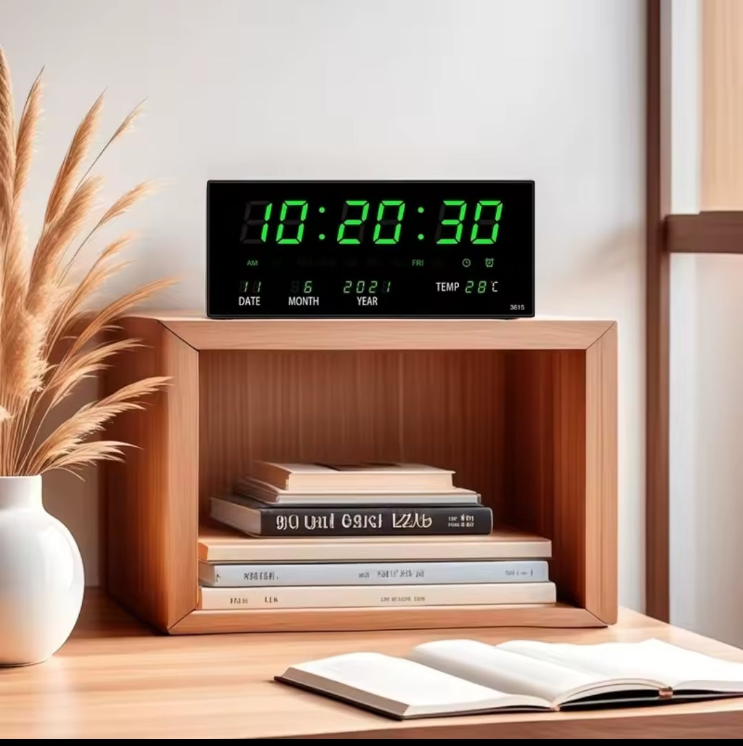 A modern multifunctional LED clock perfect for bedside tables, office desks, and home décor. Displays time, date, temperature, and comes with a built-in alarm and adjustable brightness levels for day and night comfort.