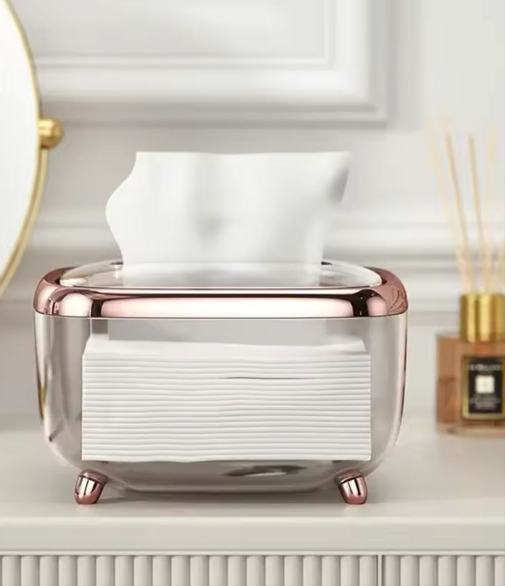 Bring elegance to your tabletop with this Luxury Tissue/Serviette Holder featuring a clear acrylic body and rose gold accents. The sleek lid keeps tissues protected and dust-free, while the elevated feet and premium finish make it a standout decor piece.
