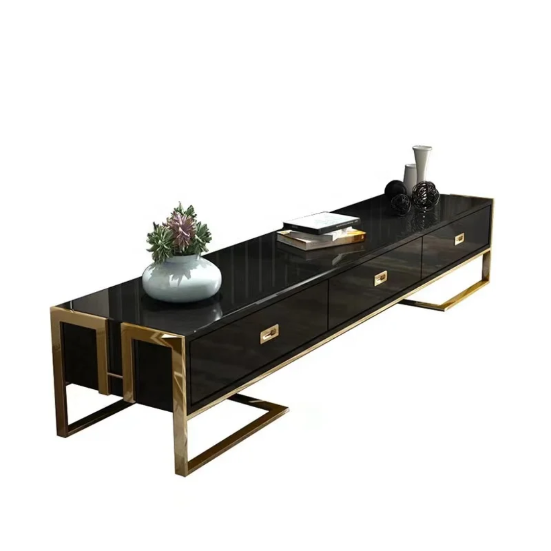 Furaha Finds Modern Black Glass TV Stand with Gold Frame and Storage Drawers