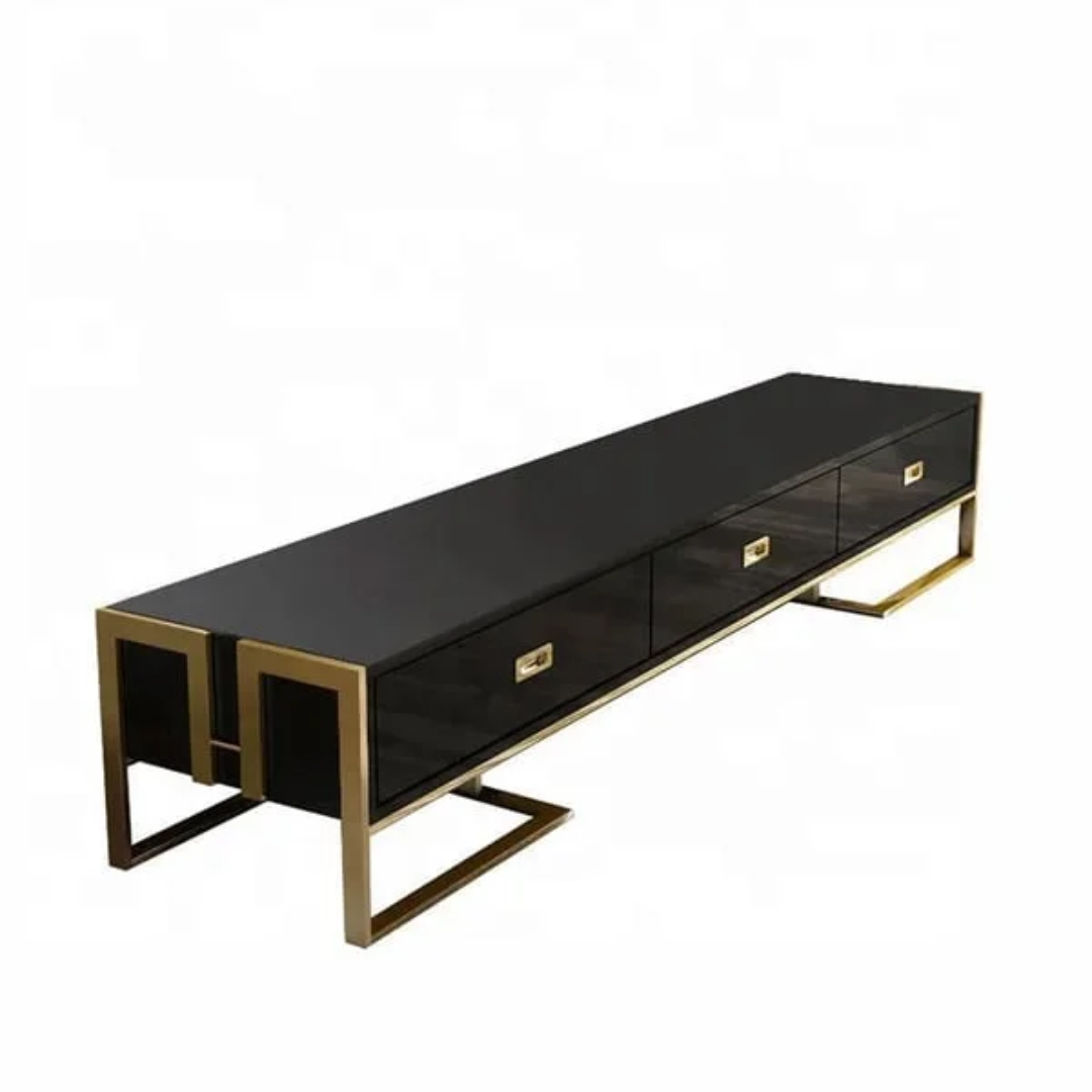 Elevate your living room with this sleek TV stand featuring a glossy black glass top and a striking gold metal frame. Designed with spacious drawers, it offers both functionality and a modern touch to your entertainment area.