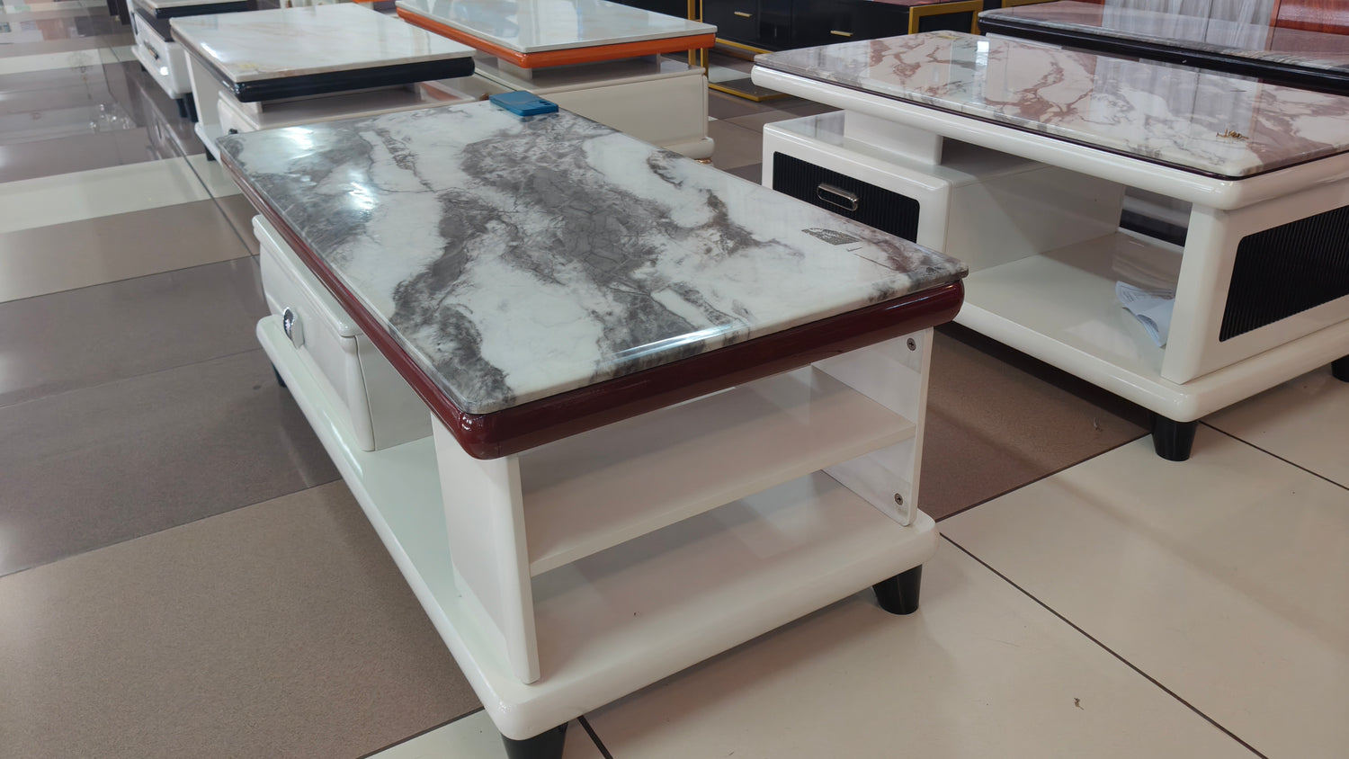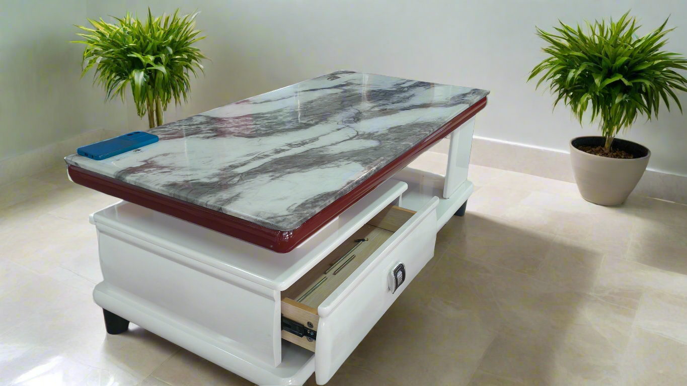 A stylish coffee table featuring a sleek marble top and built-in storage drawers. Designed for both function and elegance, it’s the perfect centerpiece for your living room, offering space for essentials while elevating your home décor.