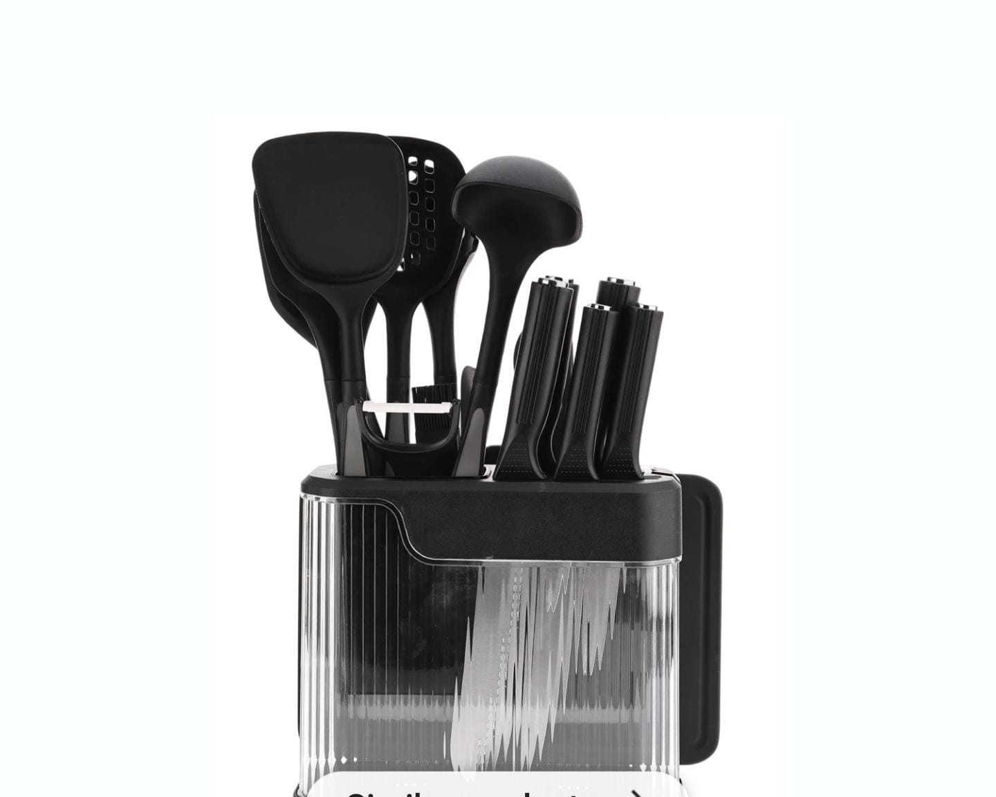 ● Includes 5 knives, 1 peeler, 1 pair of scissors, 1 chopping board, 8 silicone spoons, 1 utensil holder