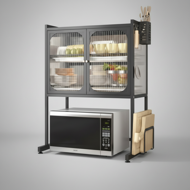 Upgrade your kitchen with this stylish and practical storage solution featuring elegant design and versatile functionality. This modern kitchen storage rack is perfect for kitchens, countertops, and dining areas, offering spacious shelves for plates, cups, kitchen essentials, and a dedicated microwave shelf. The strong and durable metal frame with glass-front cabinets creates an elegant modern look, while the side holders provide extra convenience for utensils and accessories. Keep your kitchen neat, organized, and clutter-free with this multi-functional storage unit that combines beauty with practicality.