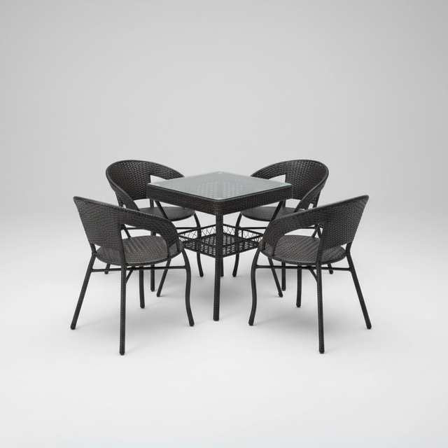 Transform your outdoor space with this elegant rattan dining set. Perfect for patios, gardens, balconies, and outdoor dining areas, this complete set includes one square glass-top table and four comfortable rattan chairs. The weather-resistant woven rattan construction withstands outdoor conditions, while the tempered glass tabletop provides a sleek, easy-to-clean surface. The curved rattan chairs offer comfortable seating with supportive backrests and armrests. Built with sturdy metal frames for durability and stability.