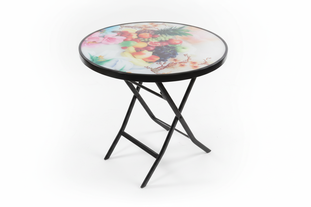 Transform any space with this elegant foldable table featuring beautiful decorative glass top designs. Perfect for both indoor and outdoor use, this versatile table combines artistic appeal with practical functionality. The stunning glass top showcases vibrant floral and nature-inspired designs including cherry blossoms, grapes, and abstract watercolor patterns, while the sturdy black metal folding frame provides stability and easy storage.