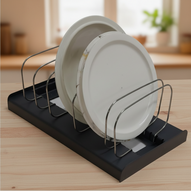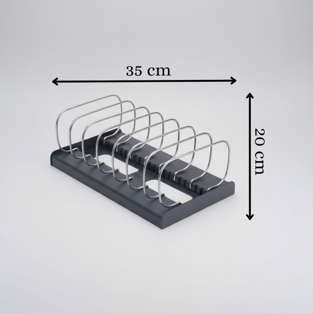 Keep your kitchen organized and clutter-free with this practical bakeware and cookware organizer featuring divided stainless steel stands on a durable plastic base. This versatile storage solution is perfect for organizing plates, pans, baking sheets, cutting boards, and lids, offering an efficient way to maximize cabinet and countertop space. The black plastic base provides stability and protects surfaces, while the stainless steel dividers keep items separated and easily accessible. The compact design fits in most cabinets, and the open structure allows for quick drying and ventilation.