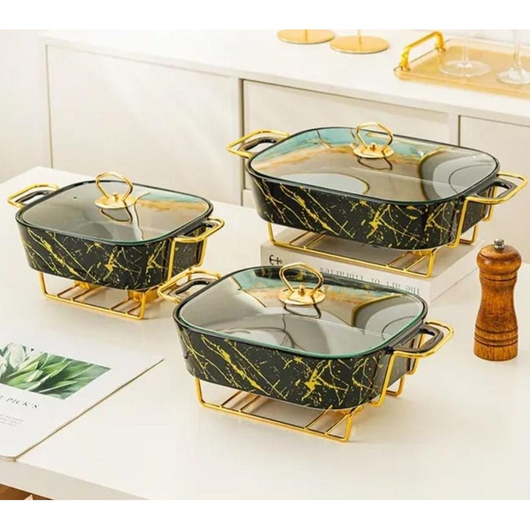 3 Piece Ceramic Food Warmers Serving Bowls Set | 3.5 Liters, 2.5 Liters, 1.8 Liters | Black, Silver | Perfect For Home Dining, Parties, & Special Occasions
