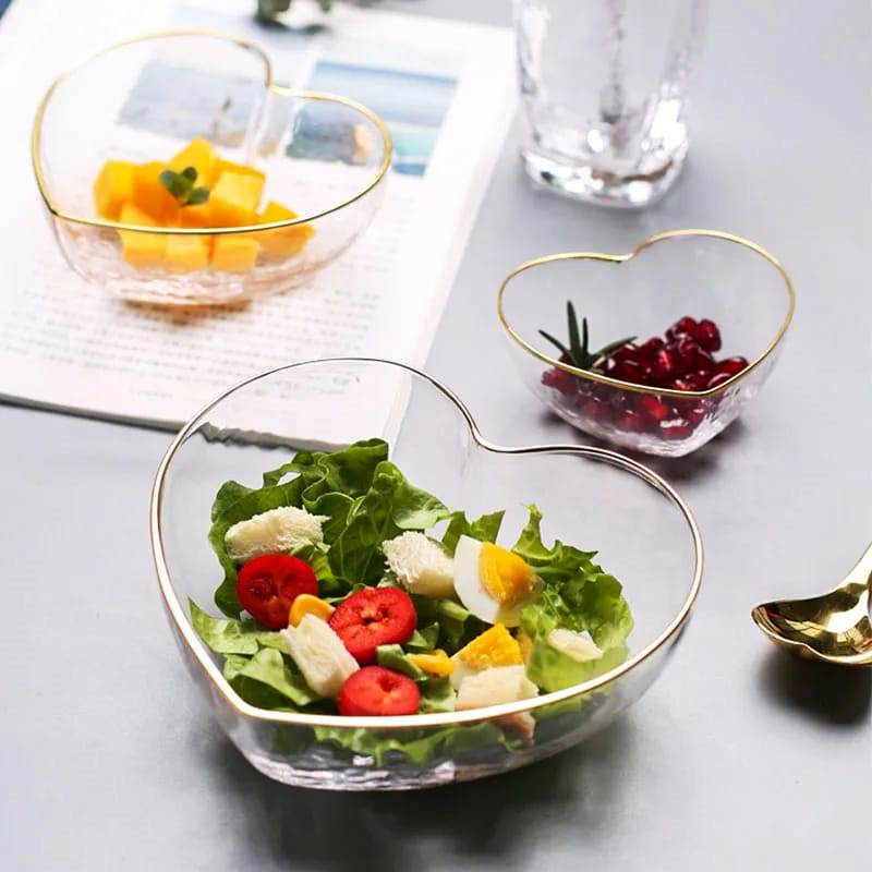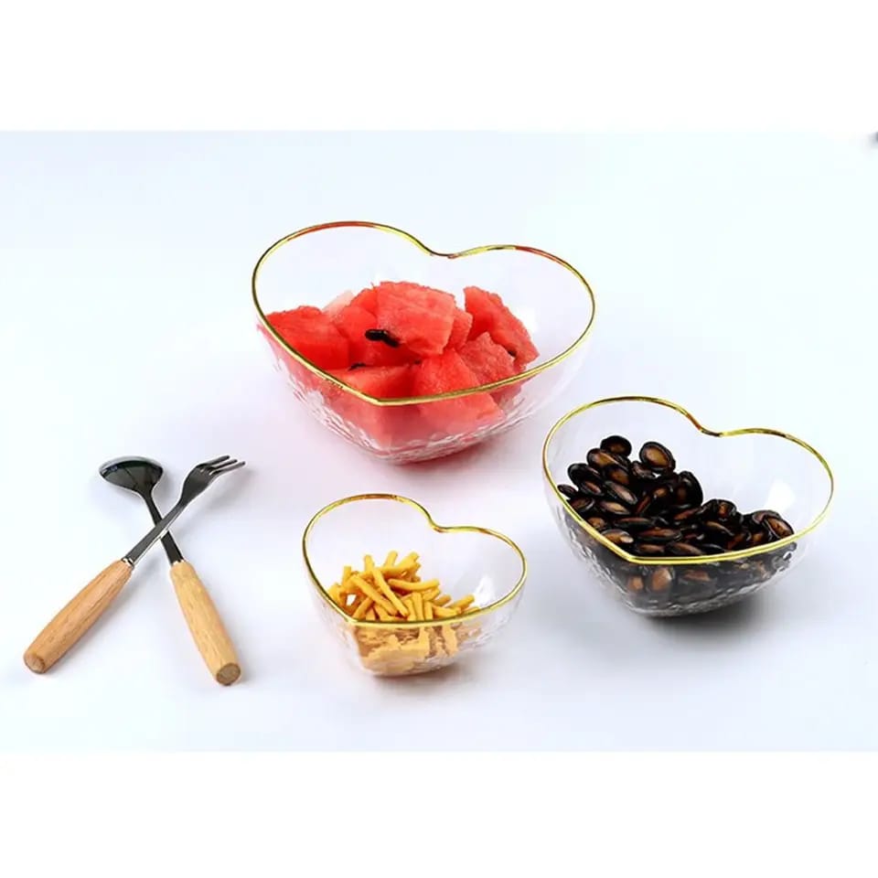 3pc Heart Shaped Glass Bowl Set | Golden Trim Hammered Pattern for Salad, Fruit, and Dessert